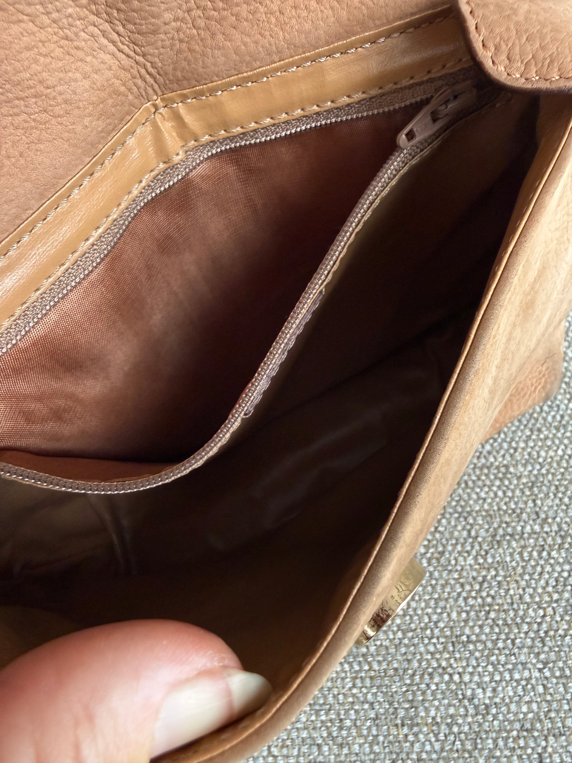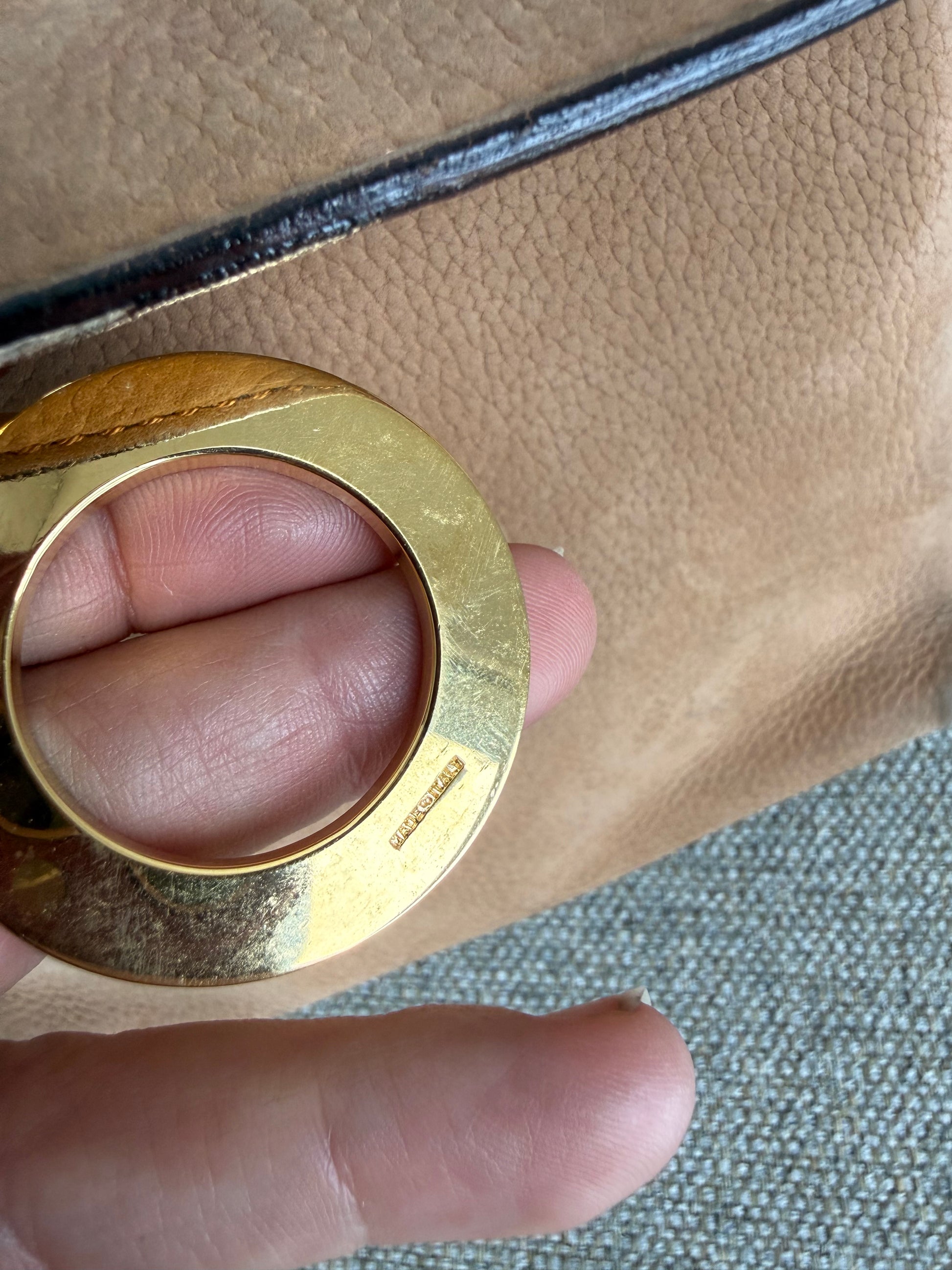 Smuk beige/sand farve med guld hardware.