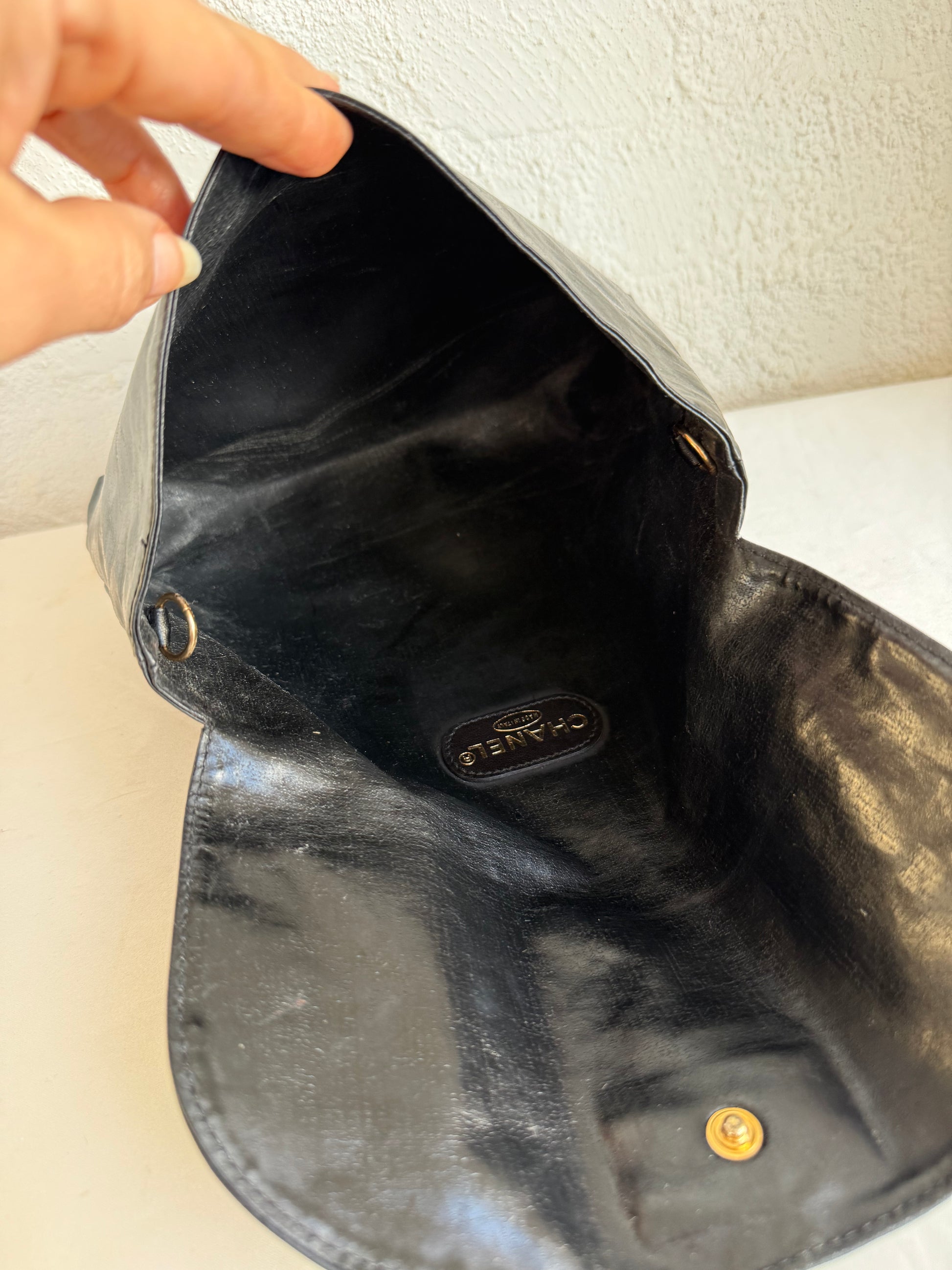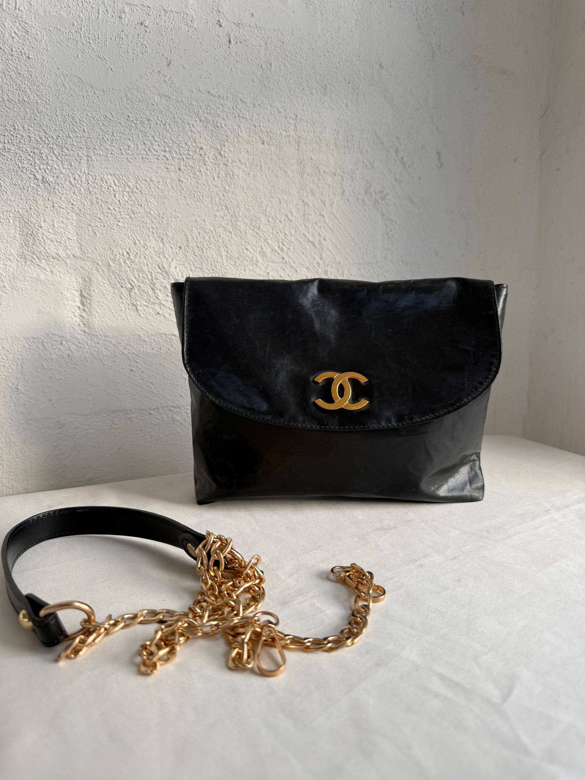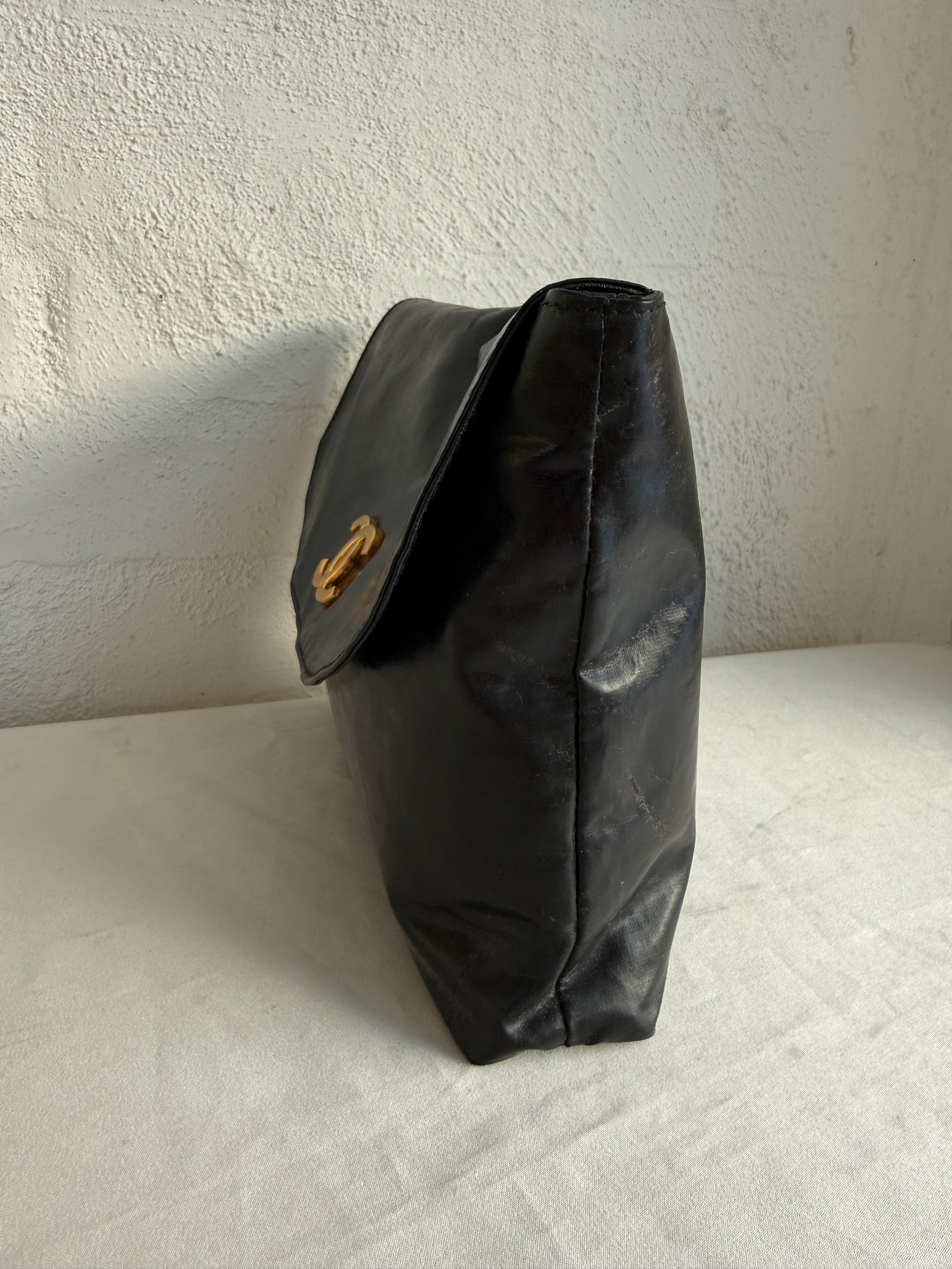 Den fineste lille taske/pouch i sort patent læder og guldhardware.