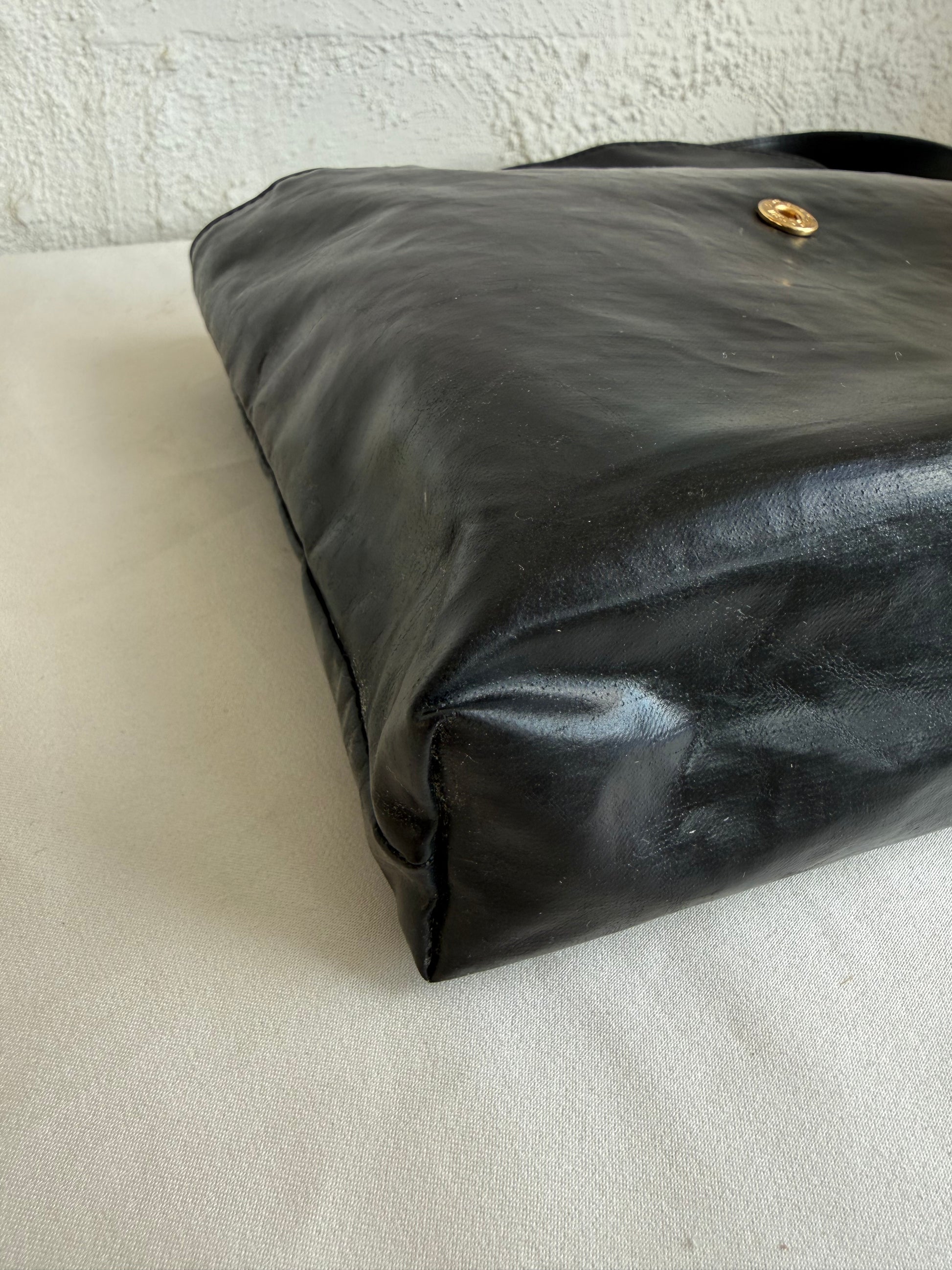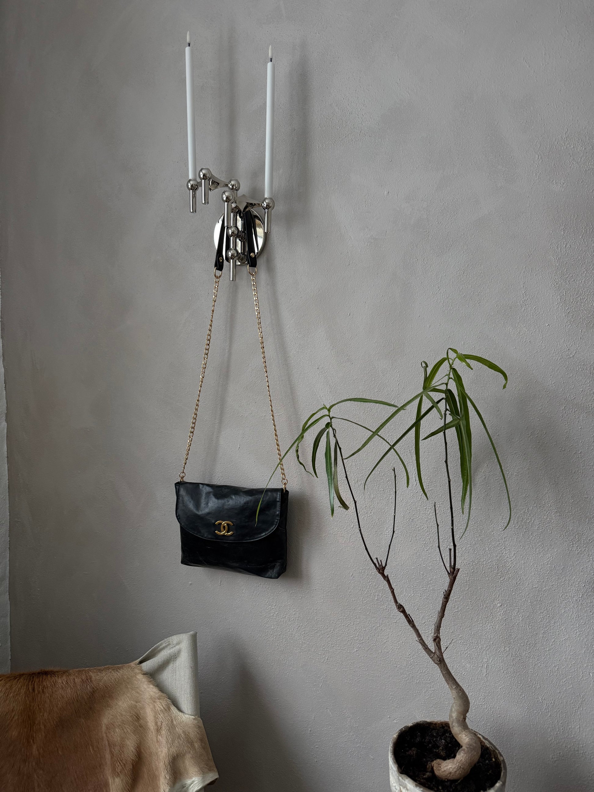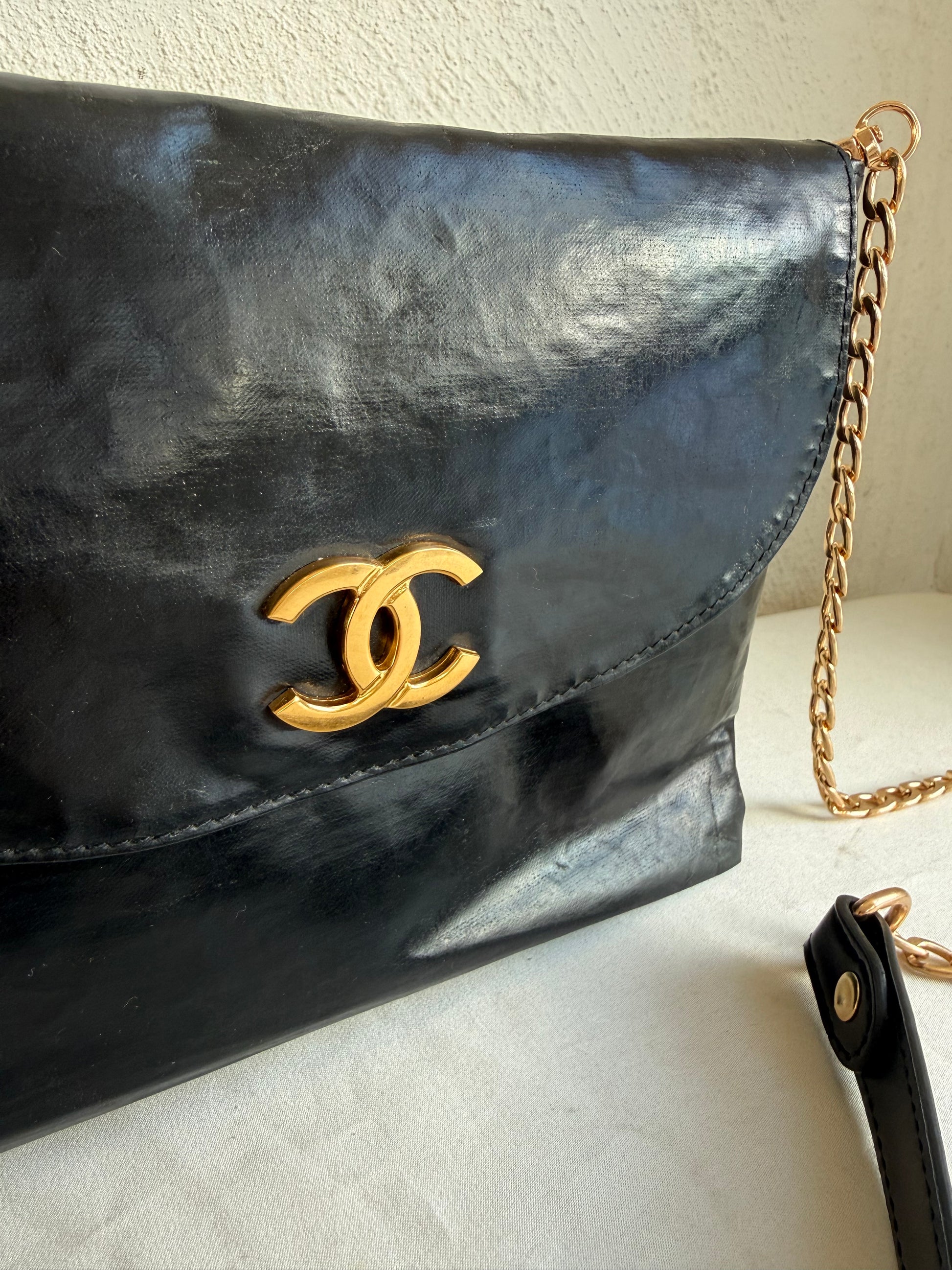 Den fineste lille taske/pouch i sort patent læder og guldhardware.