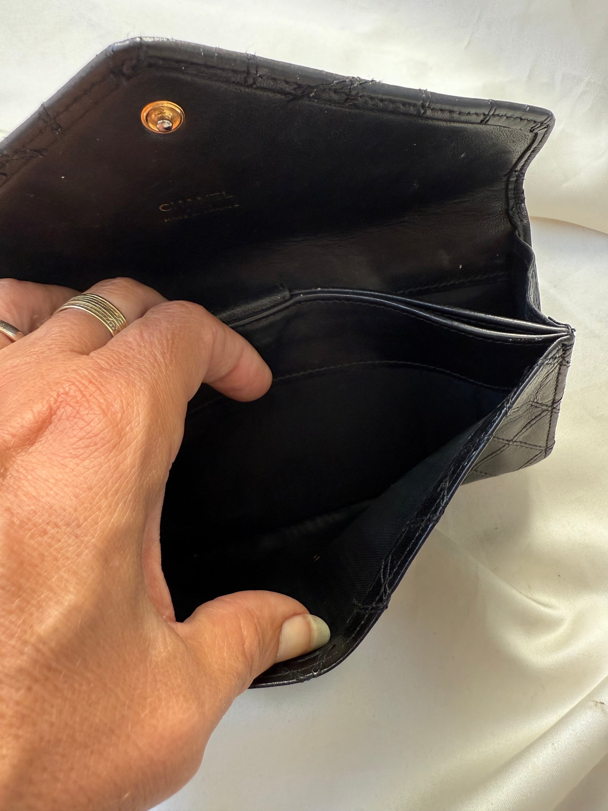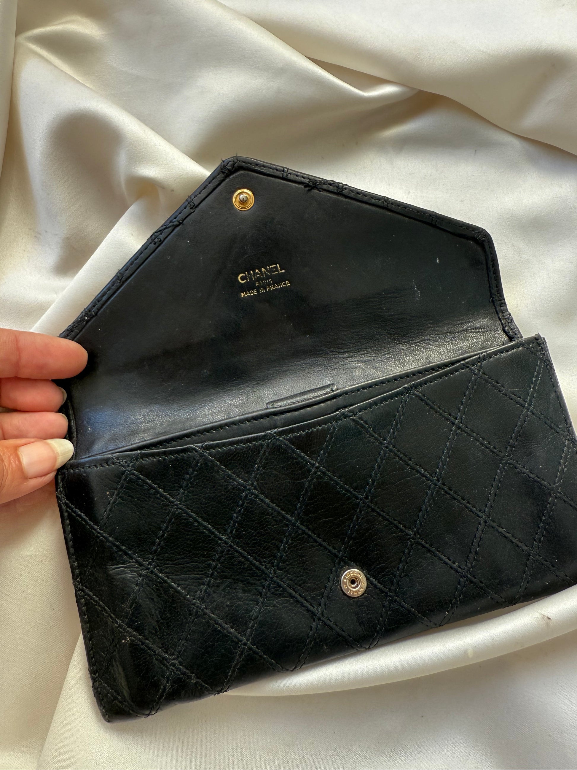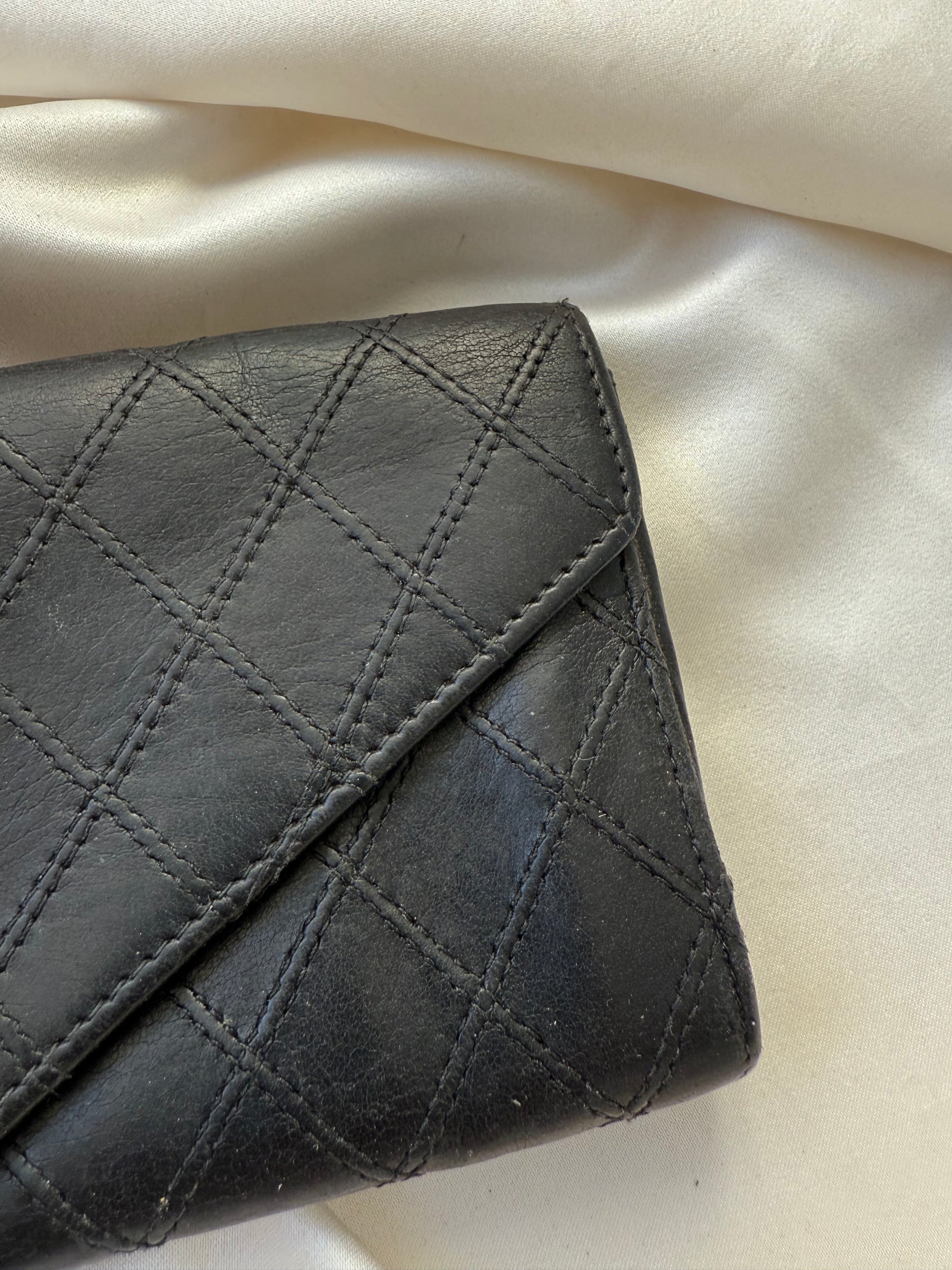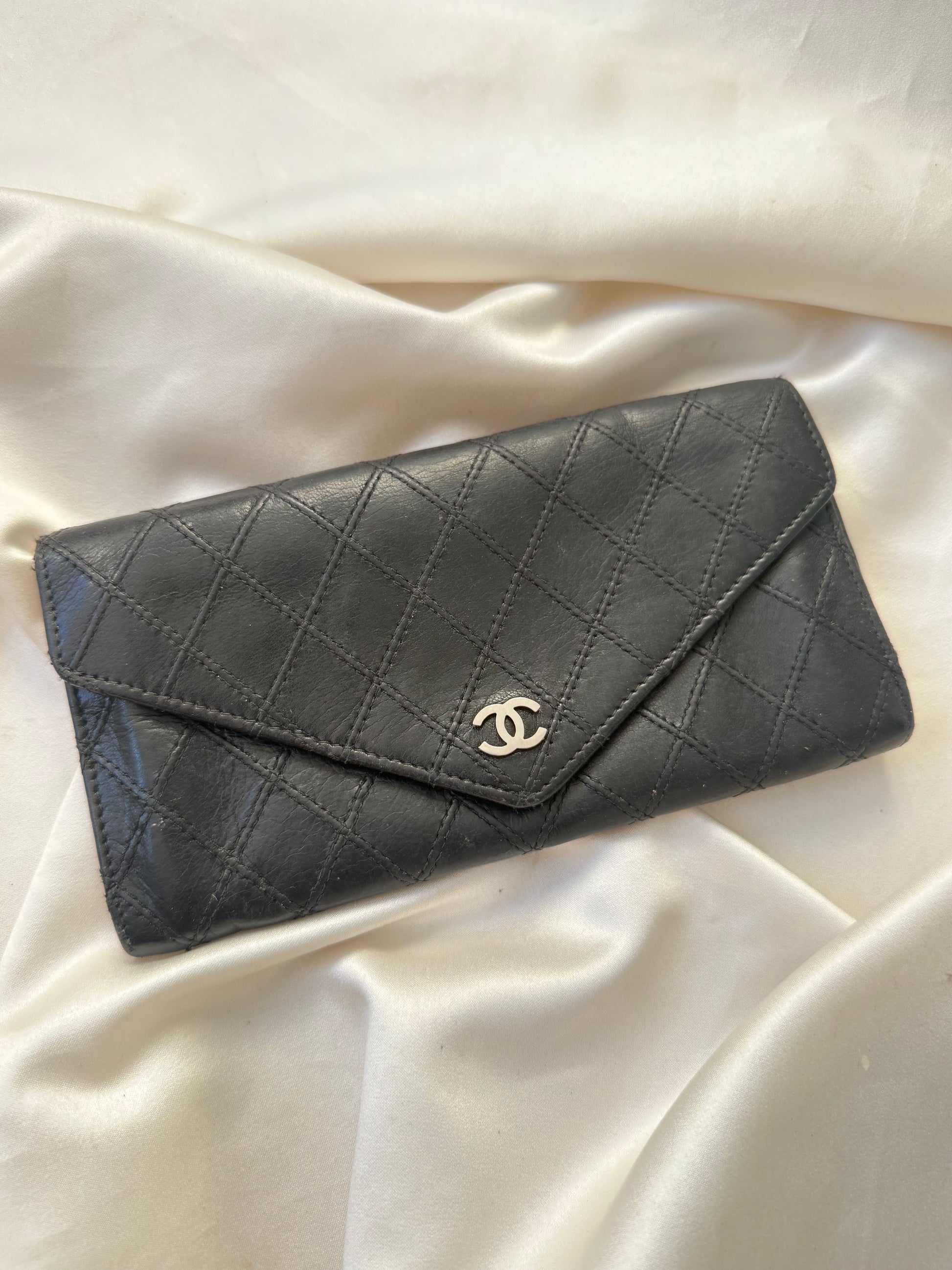 Super smuk Chanel envelope wallet i sort lammeskind med sølv hardware.