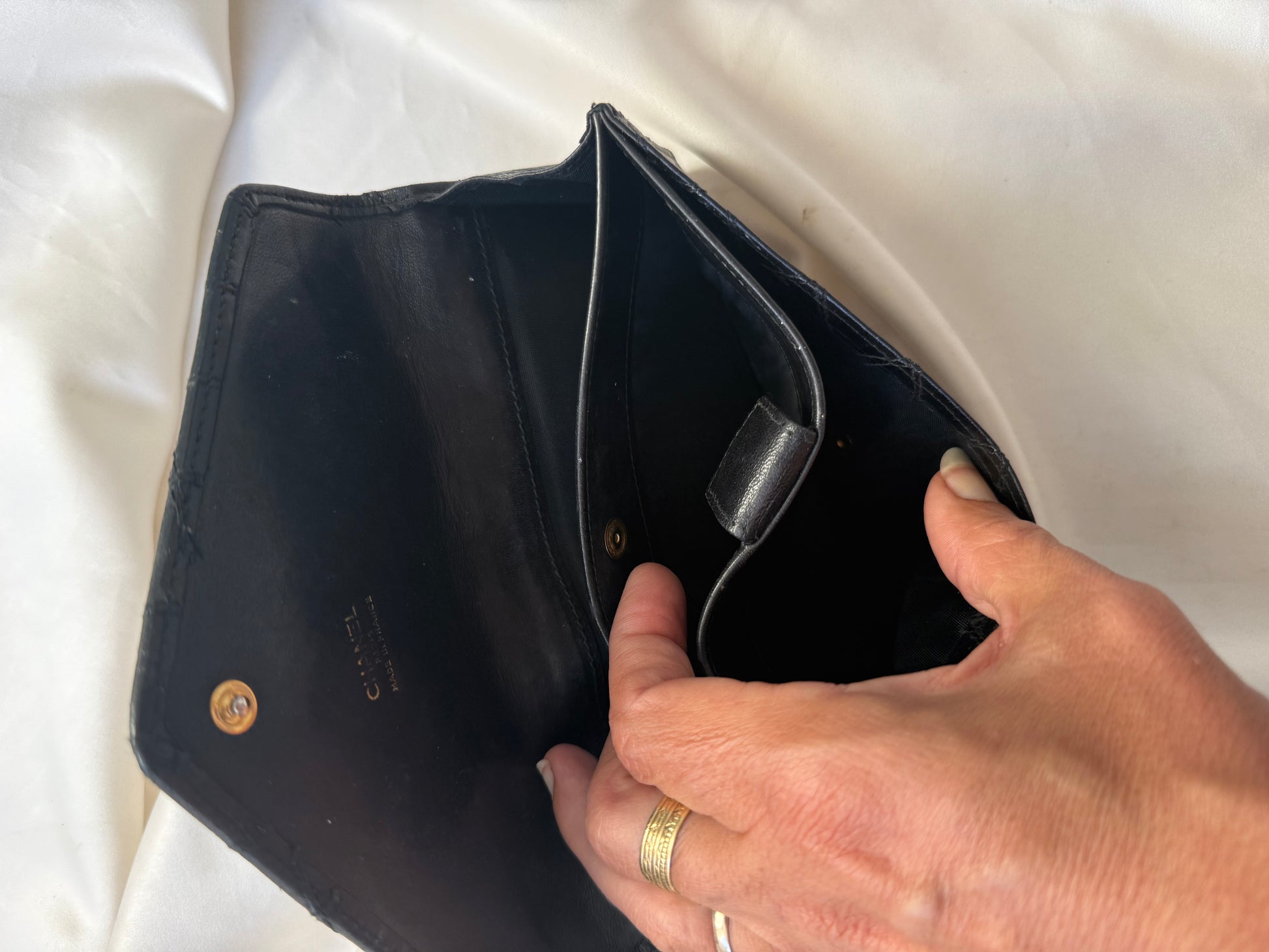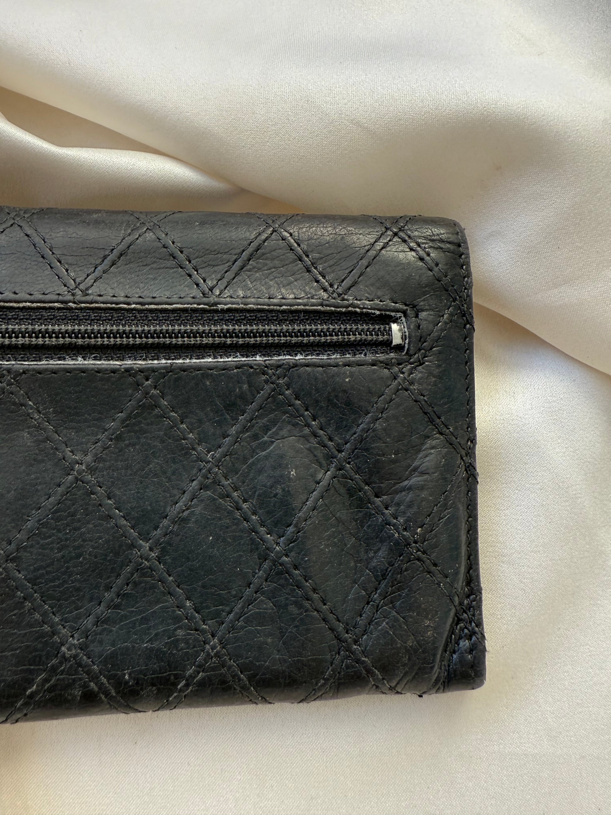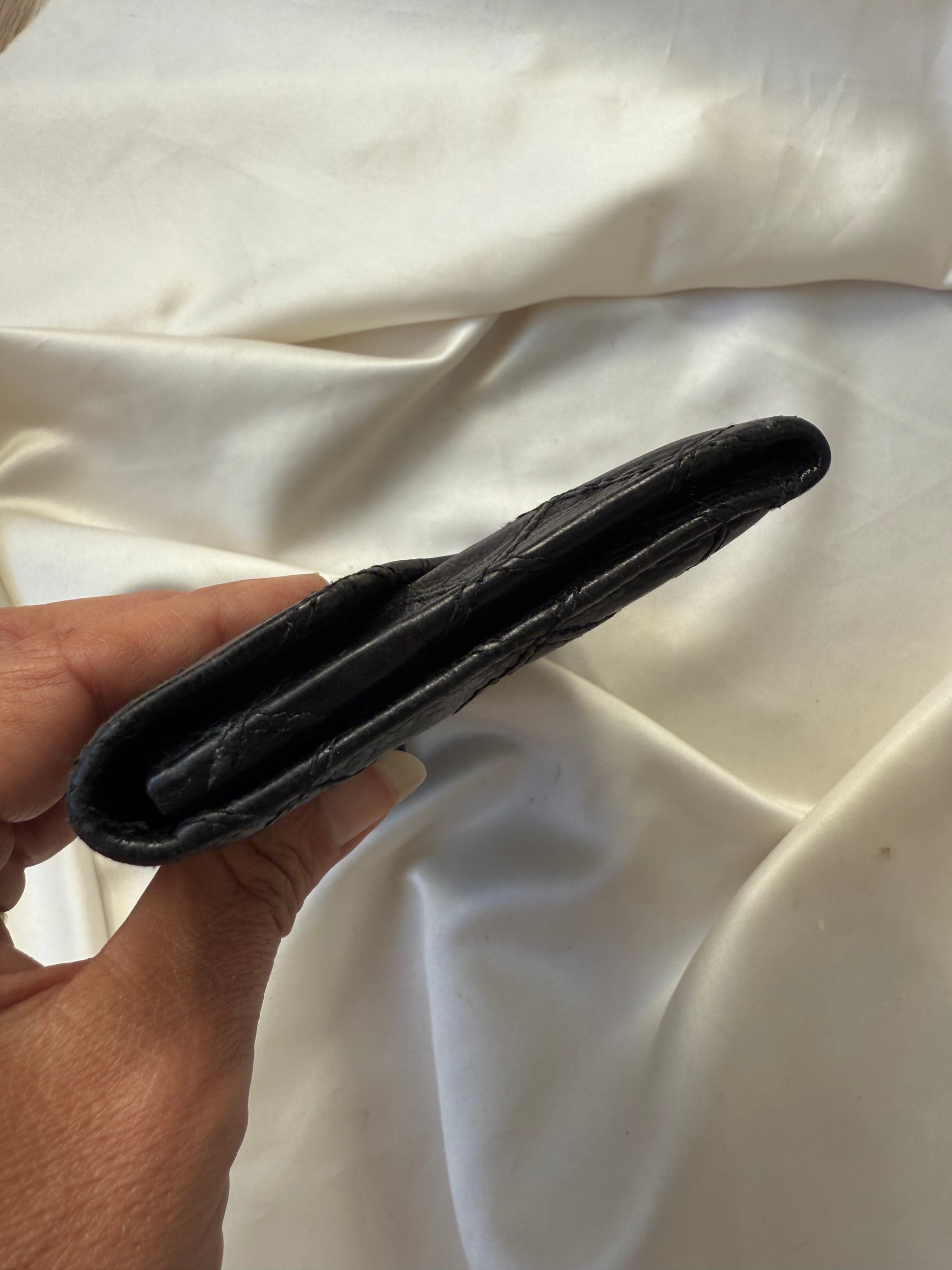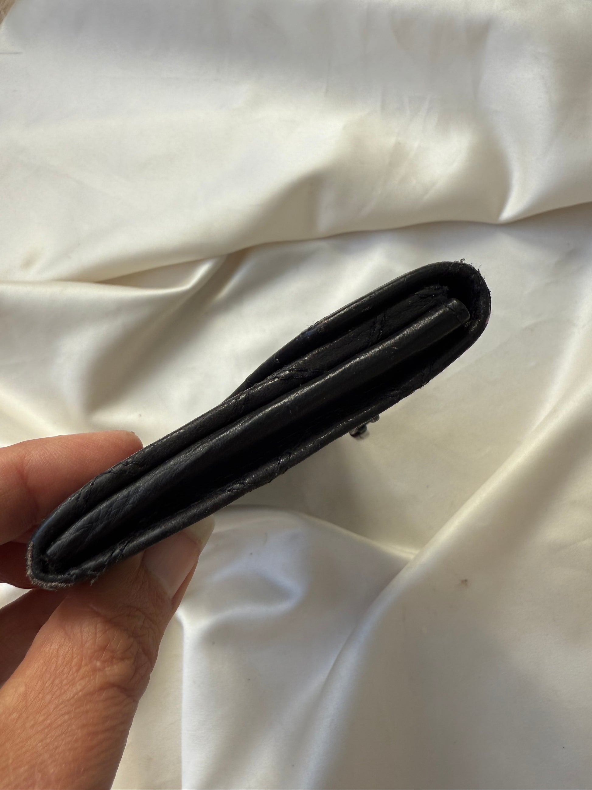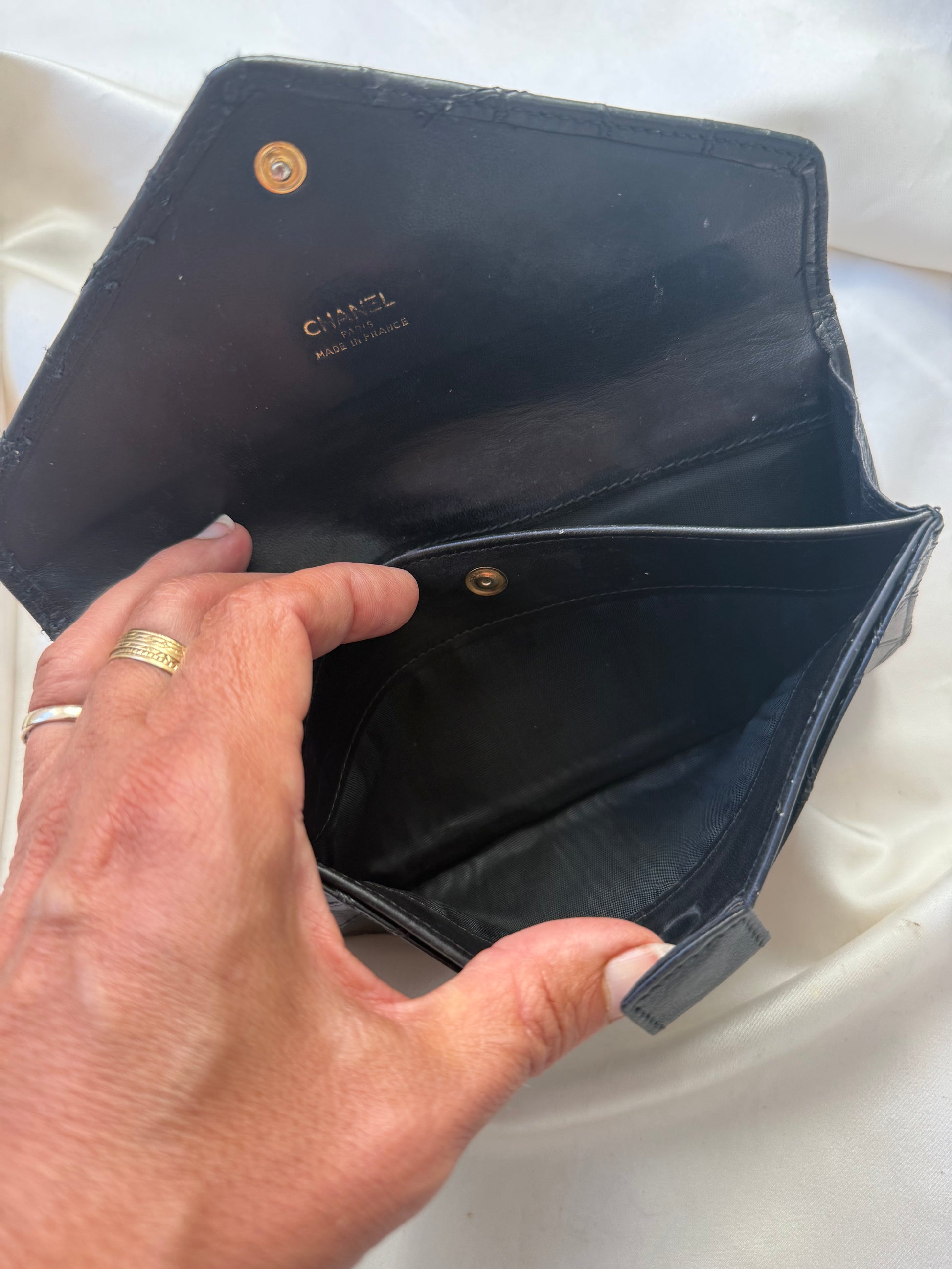 Super smuk Chanel envelope wallet i sort lammeskind med sølv hardware.