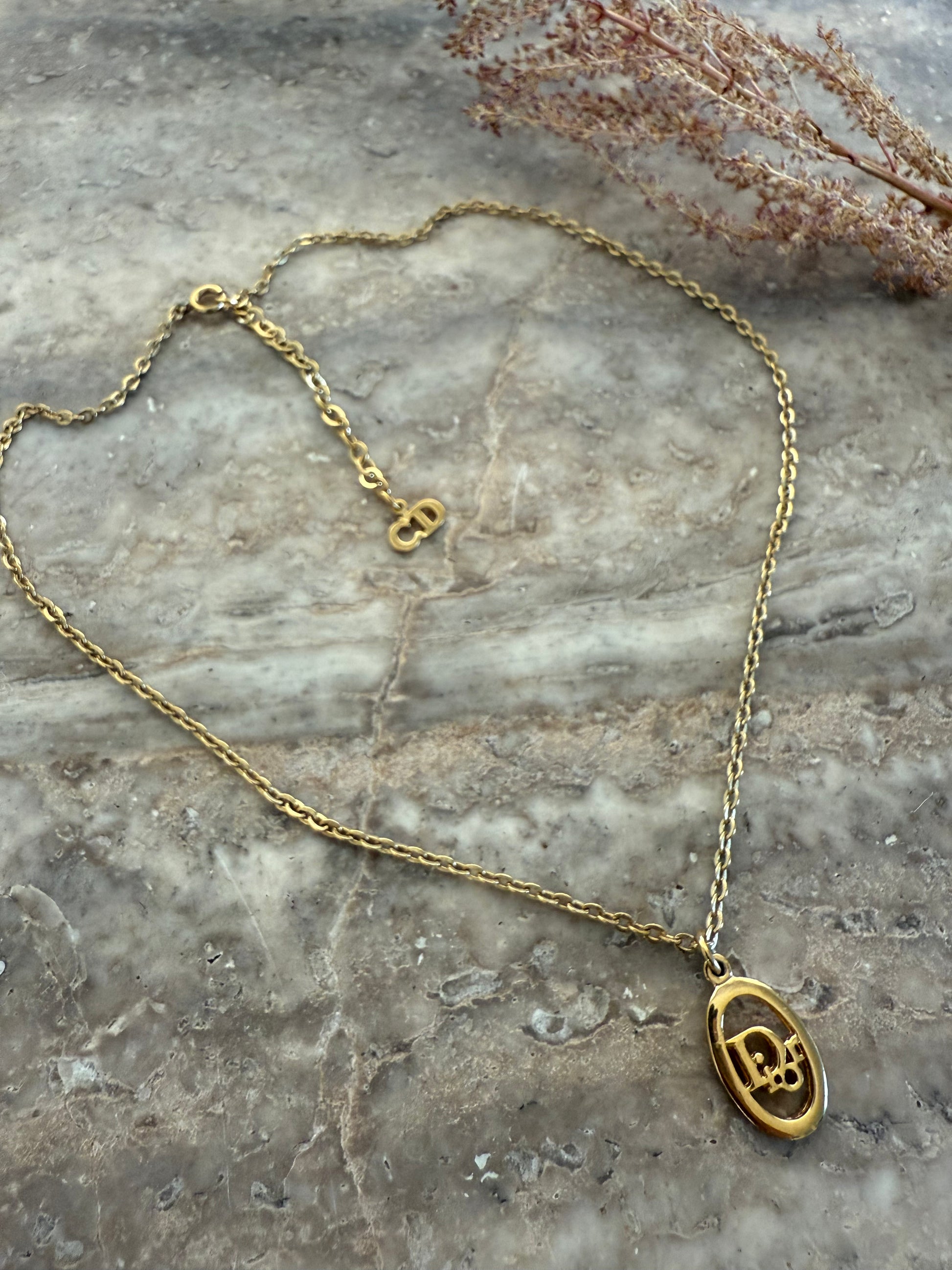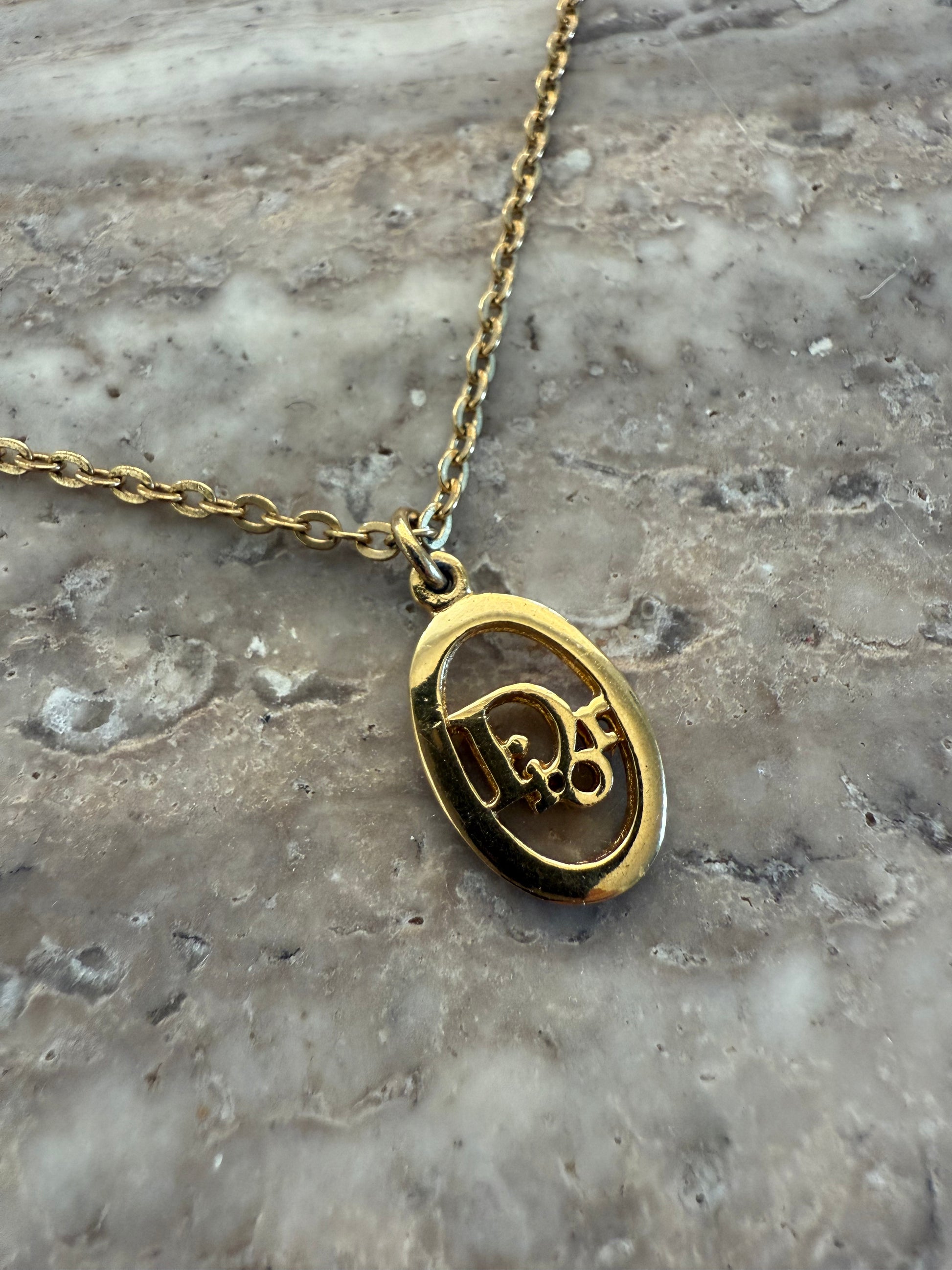 Super smuk forgyldt Christian Dior Vintage kæde med ovalt vedhæng og CD logo vedhæng på låsedelen.