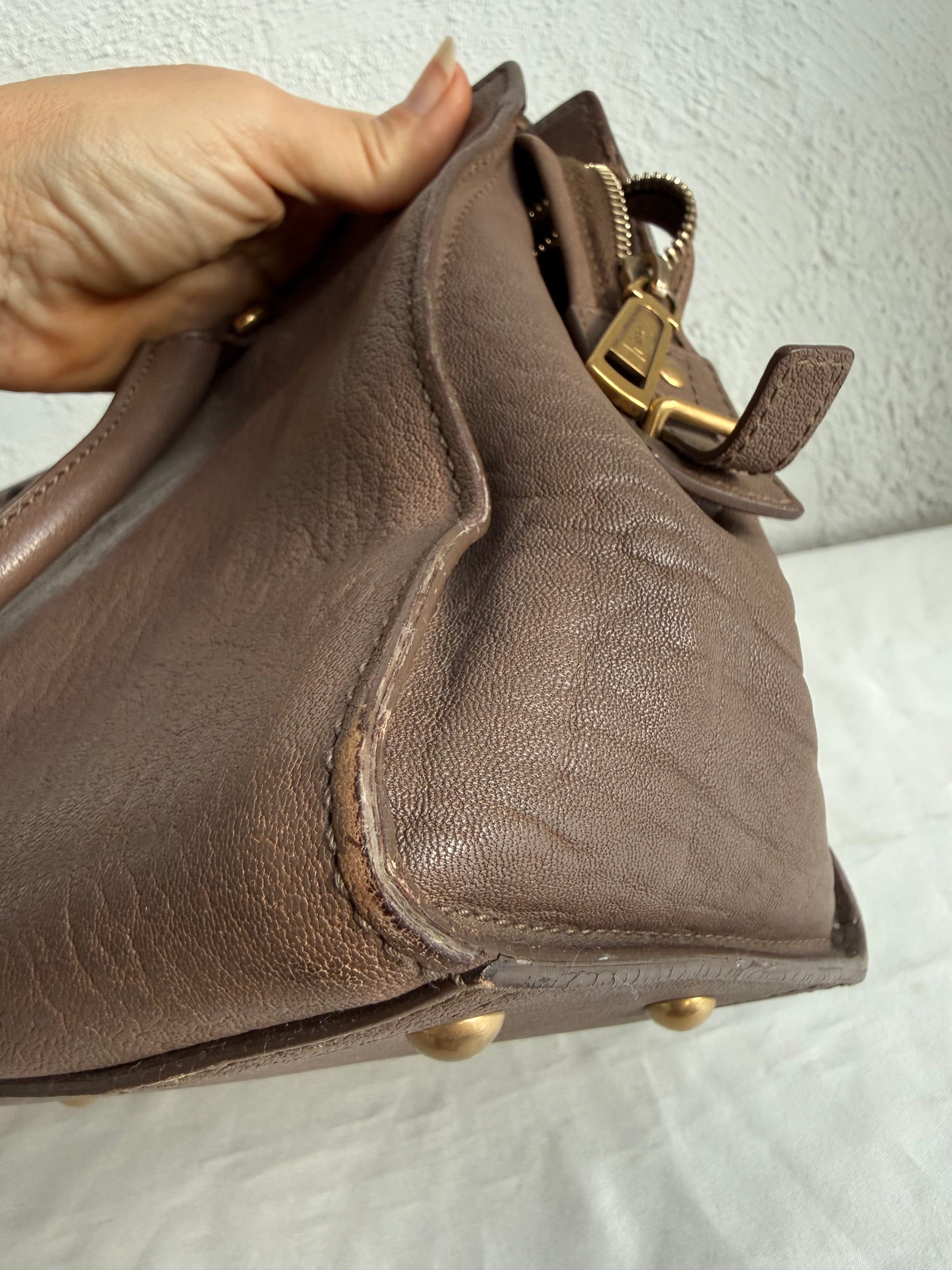 En virkelig smuk og unik taske i gråt skind med guld/sølvhardware.