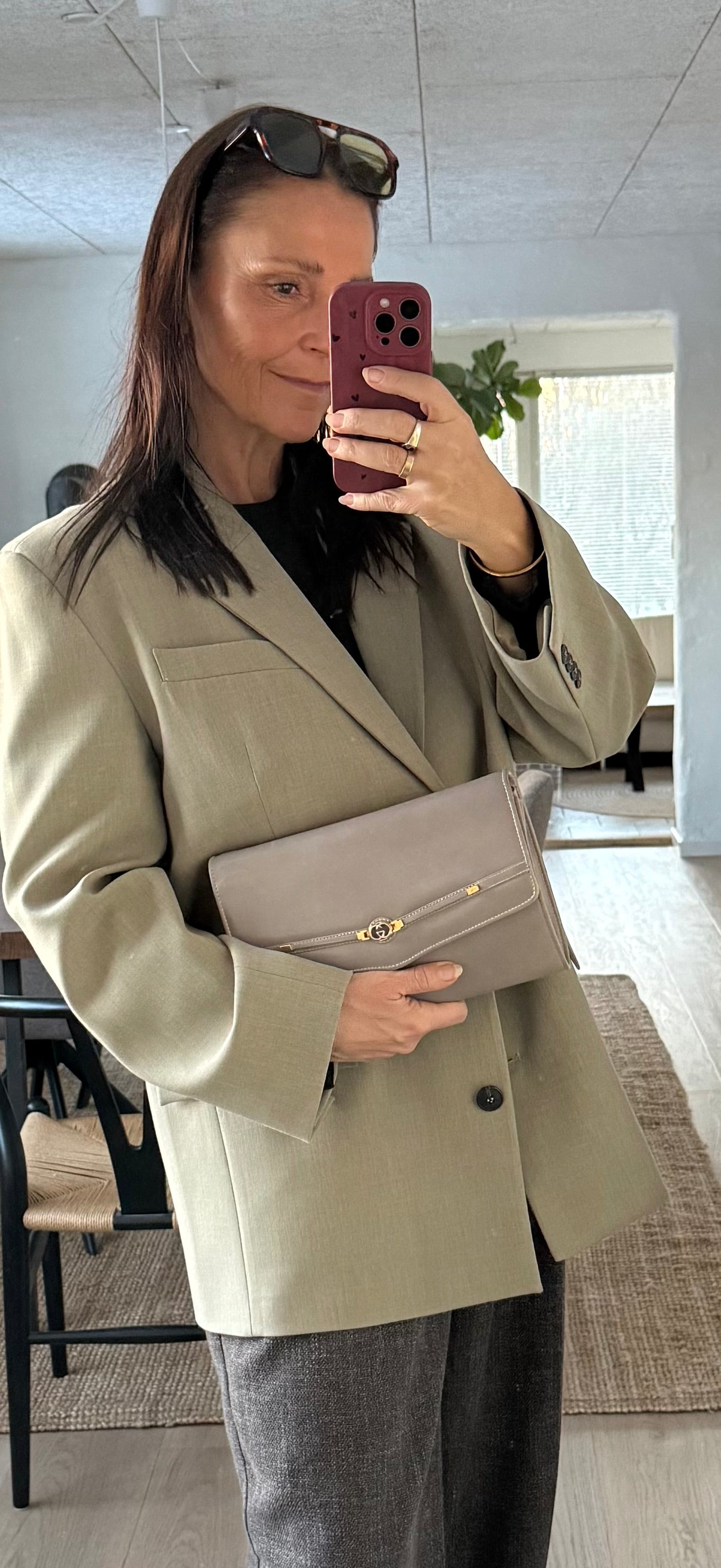 Har aftagelig rem der kan justeres. Er stort rum med lynlåslomme. Tasken kan bæres crossbody, på skulderen og som clutch.