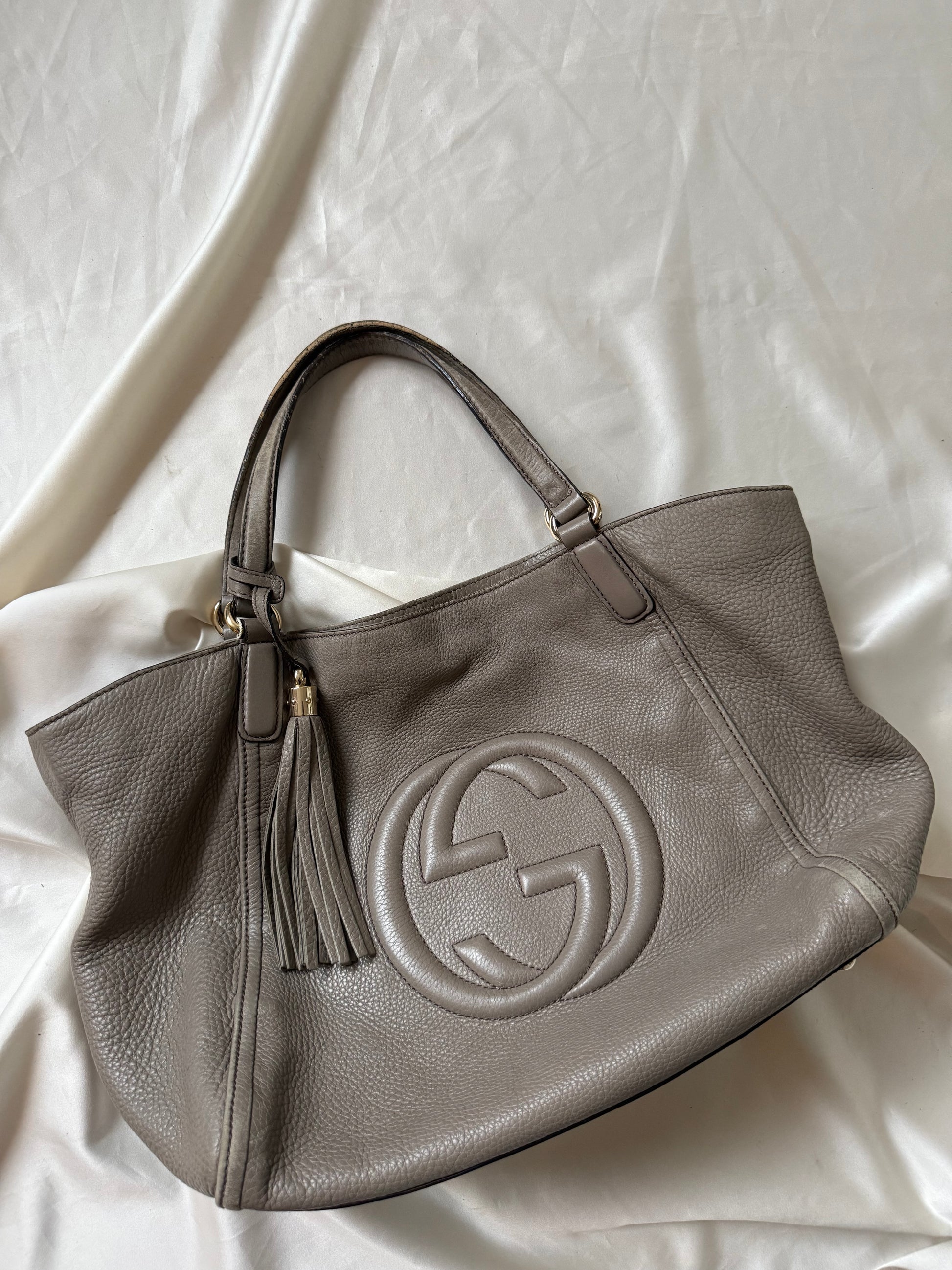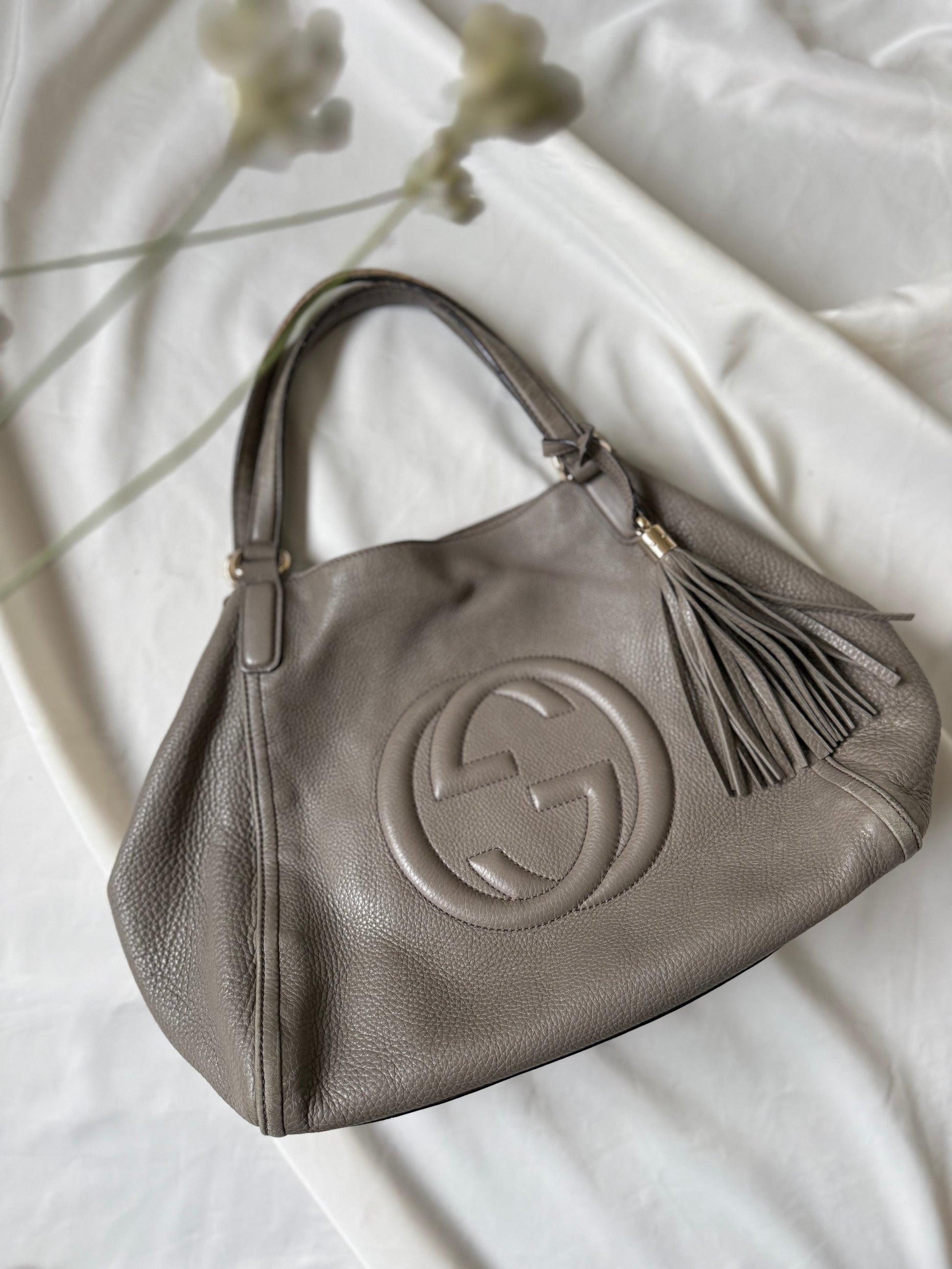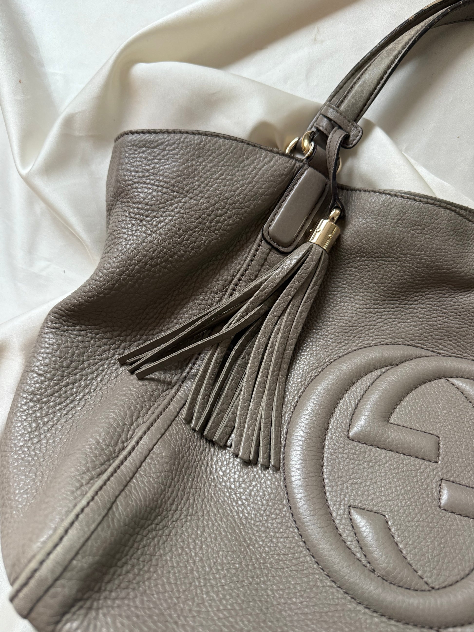 Elegant og tidløs Gucci Soho skuldertaske i smukt taupefarvet kraftigt blødt læder med det ikoniske GG-logo præget på fronten. Tasken kombinerer luksus, funktionalitet og klassisk italiensk håndværk – perfekt til både hverdagsbrug og mere elegante anledninger.