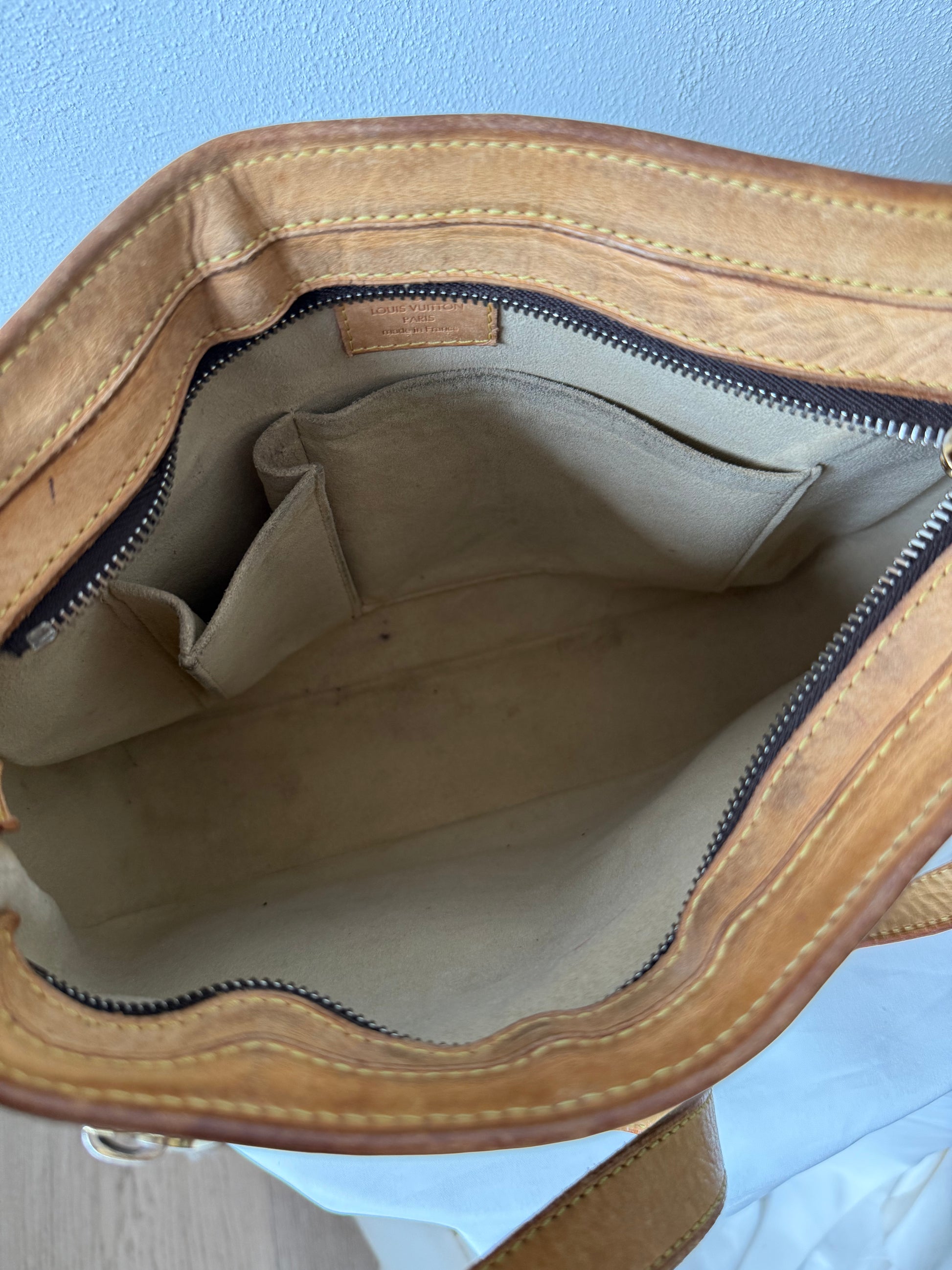 Tasken fremstår med pre-loved brugstegn på hjørnerne og patina på læderet, Foret er lidt plettet i de indvendige lommer.