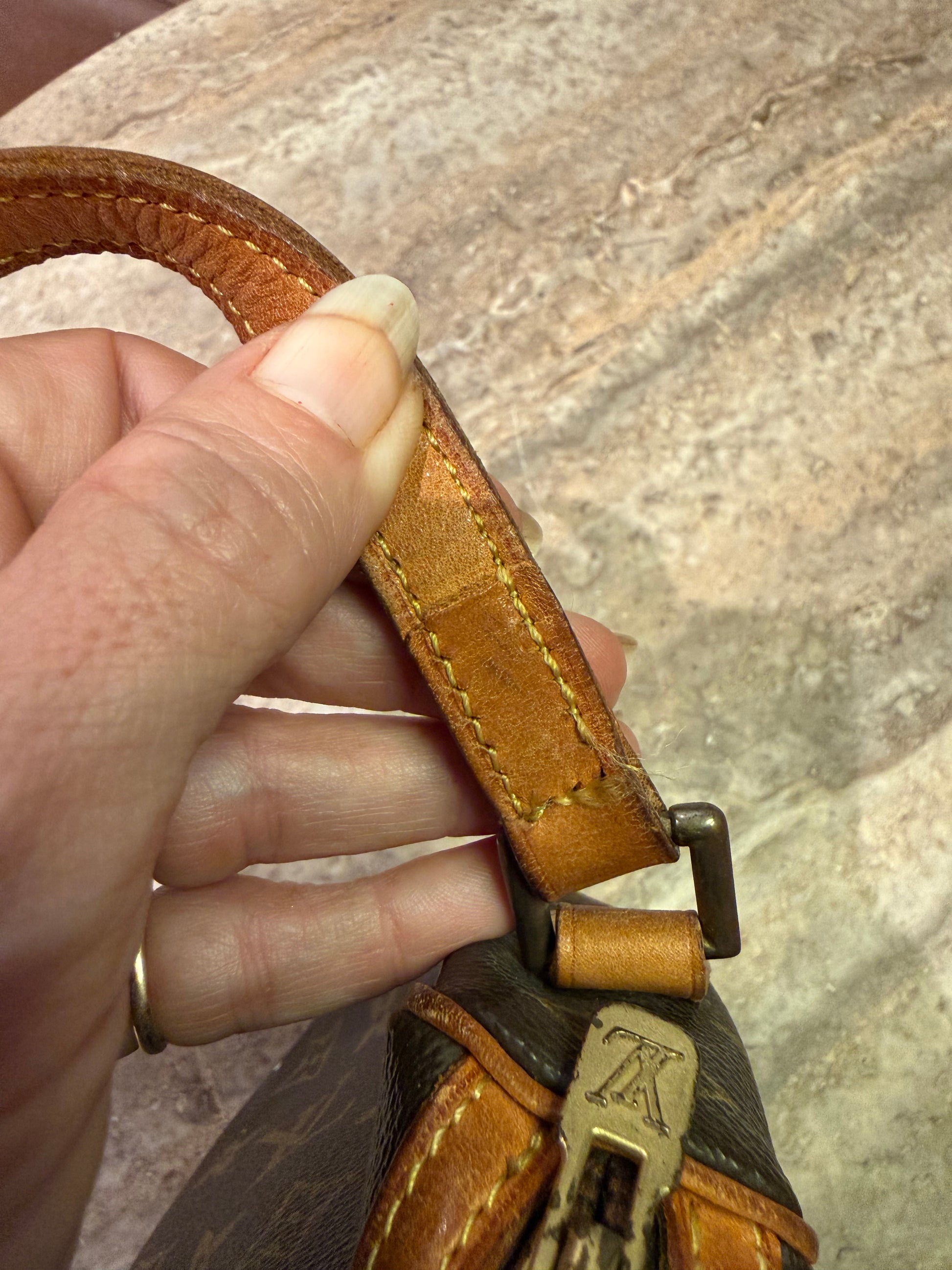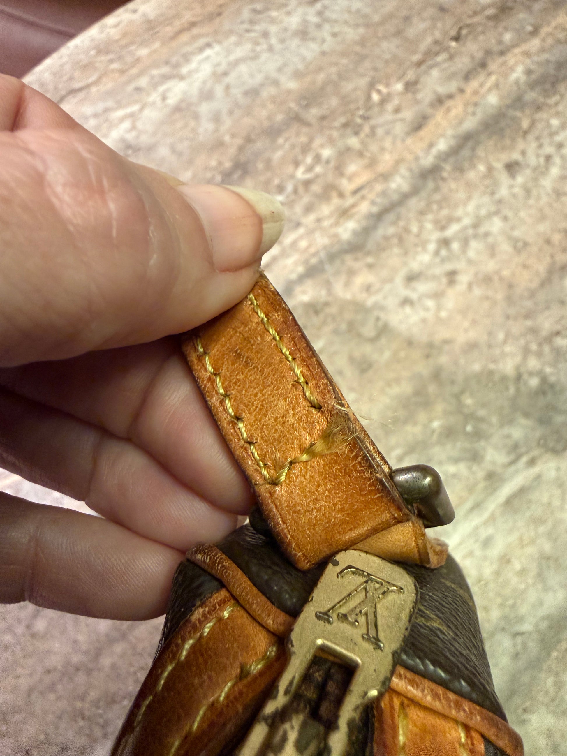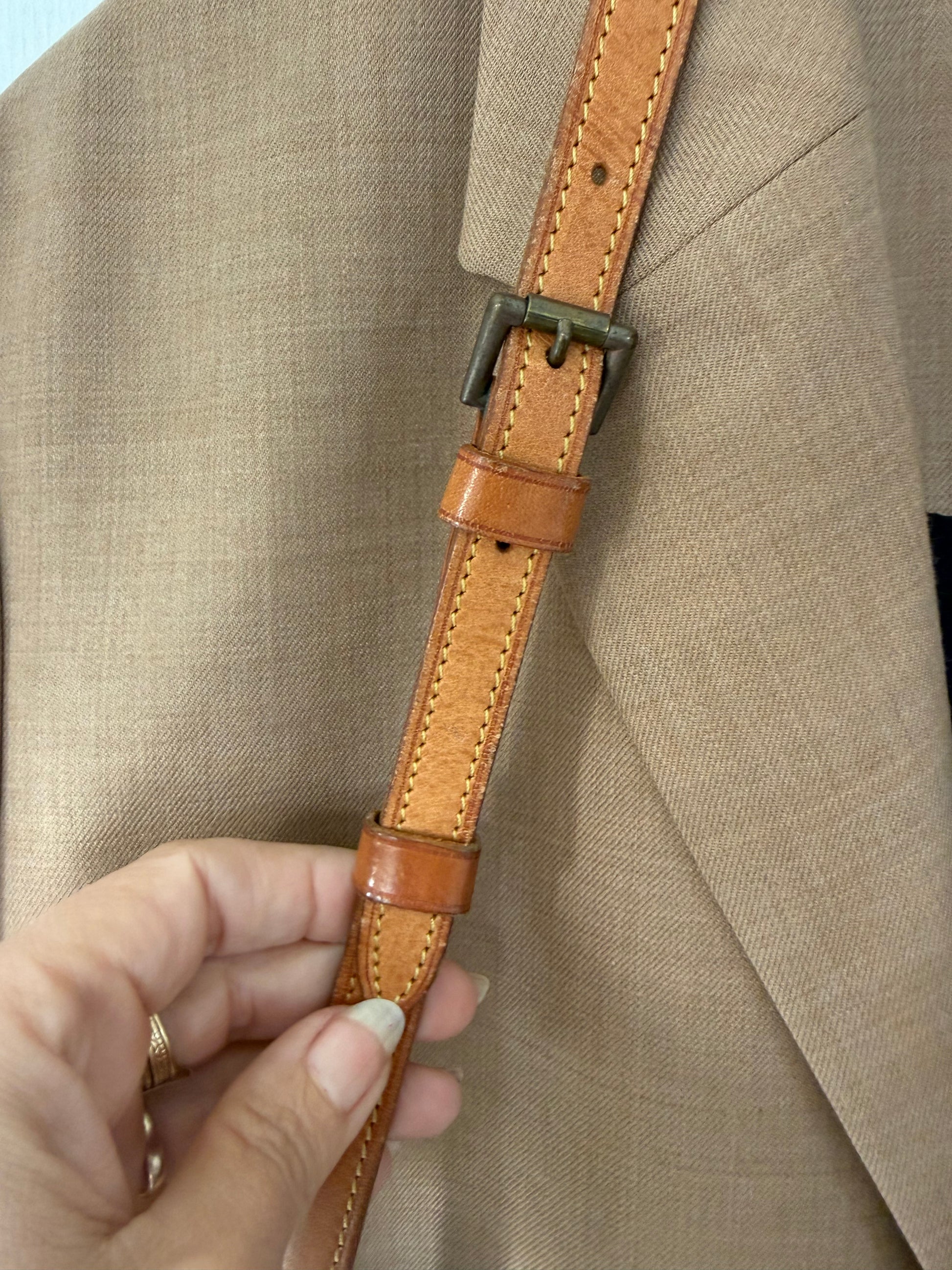 Der er gået et par sting på remmen (se billede) ellers fremstår tasken i smuk stand. Datokoden er ulæselig.