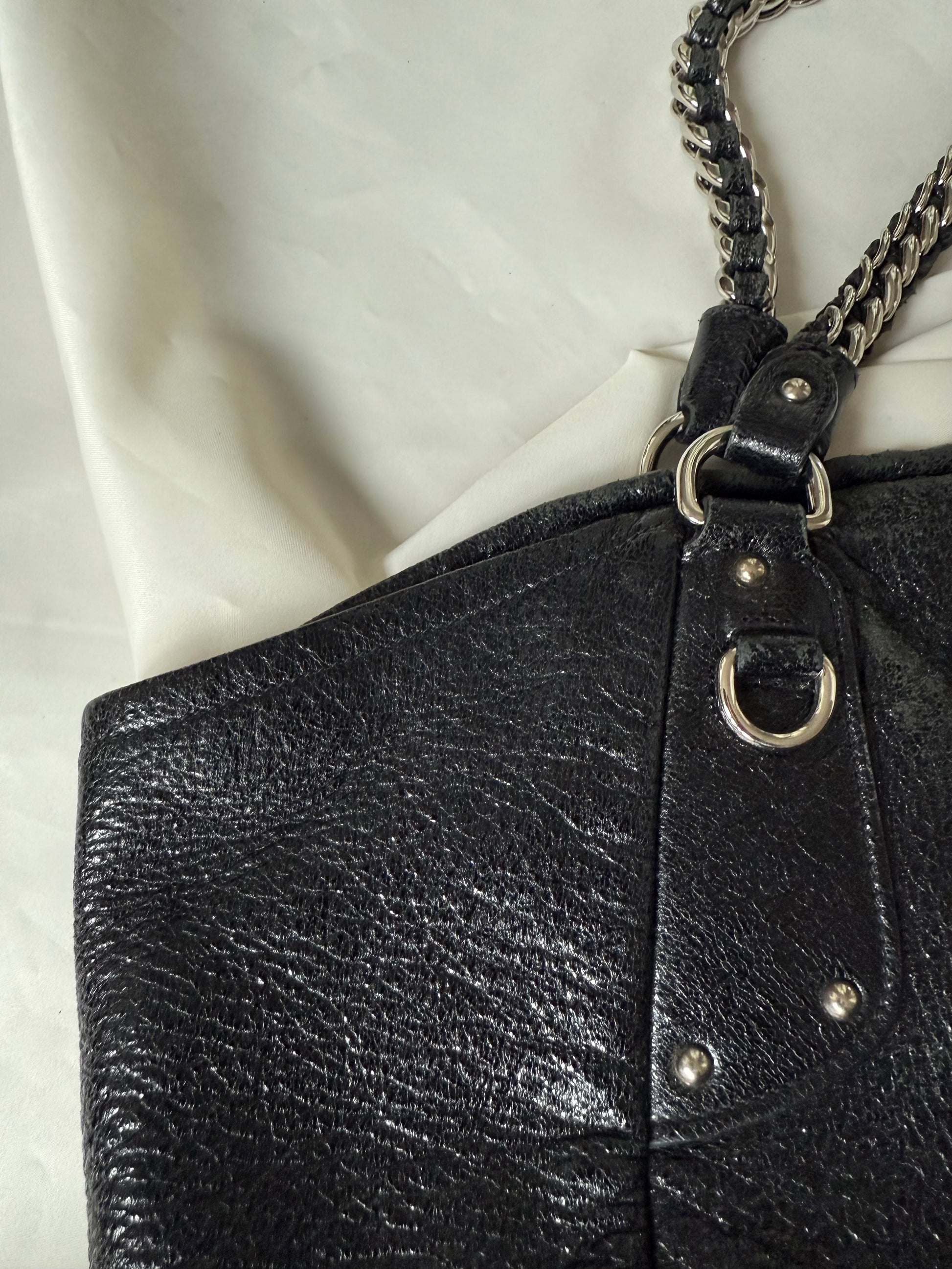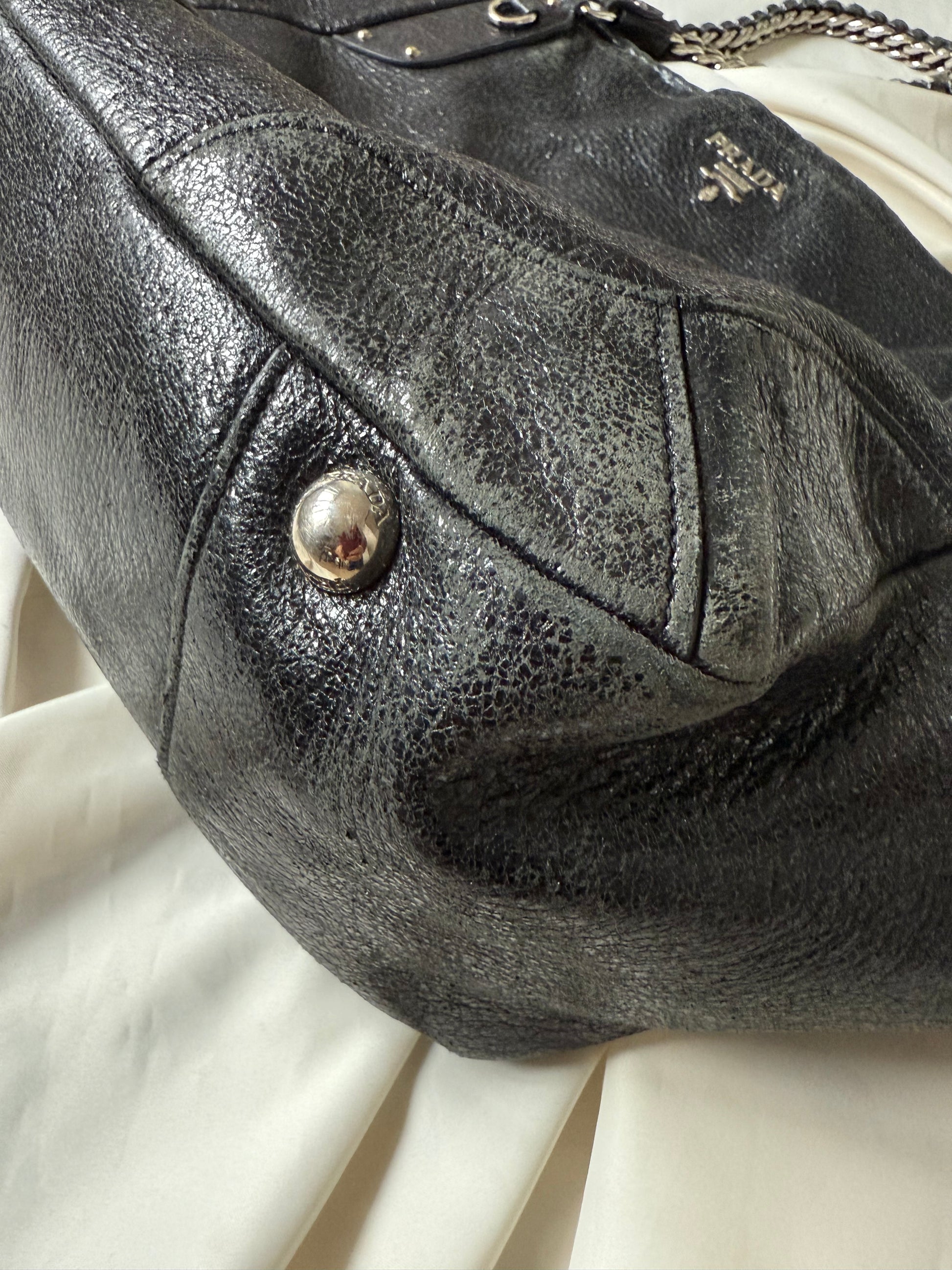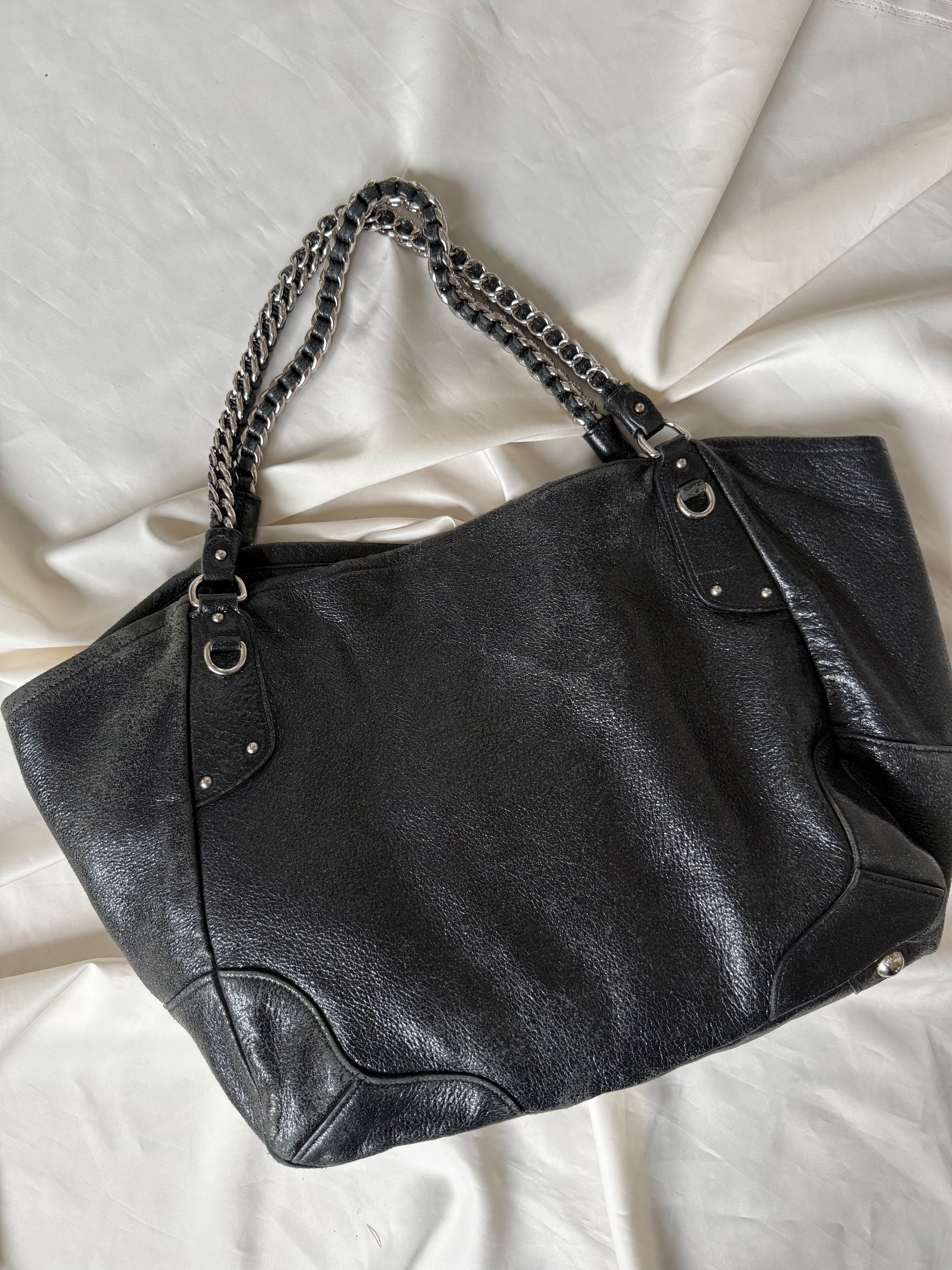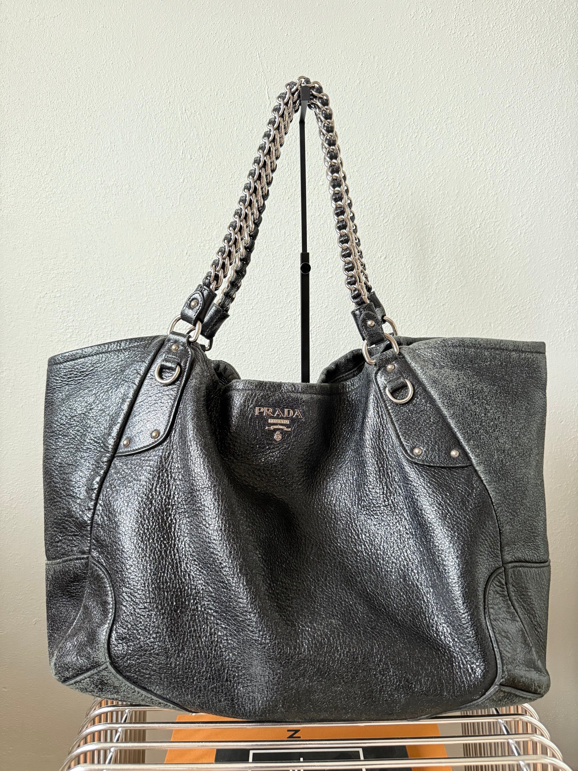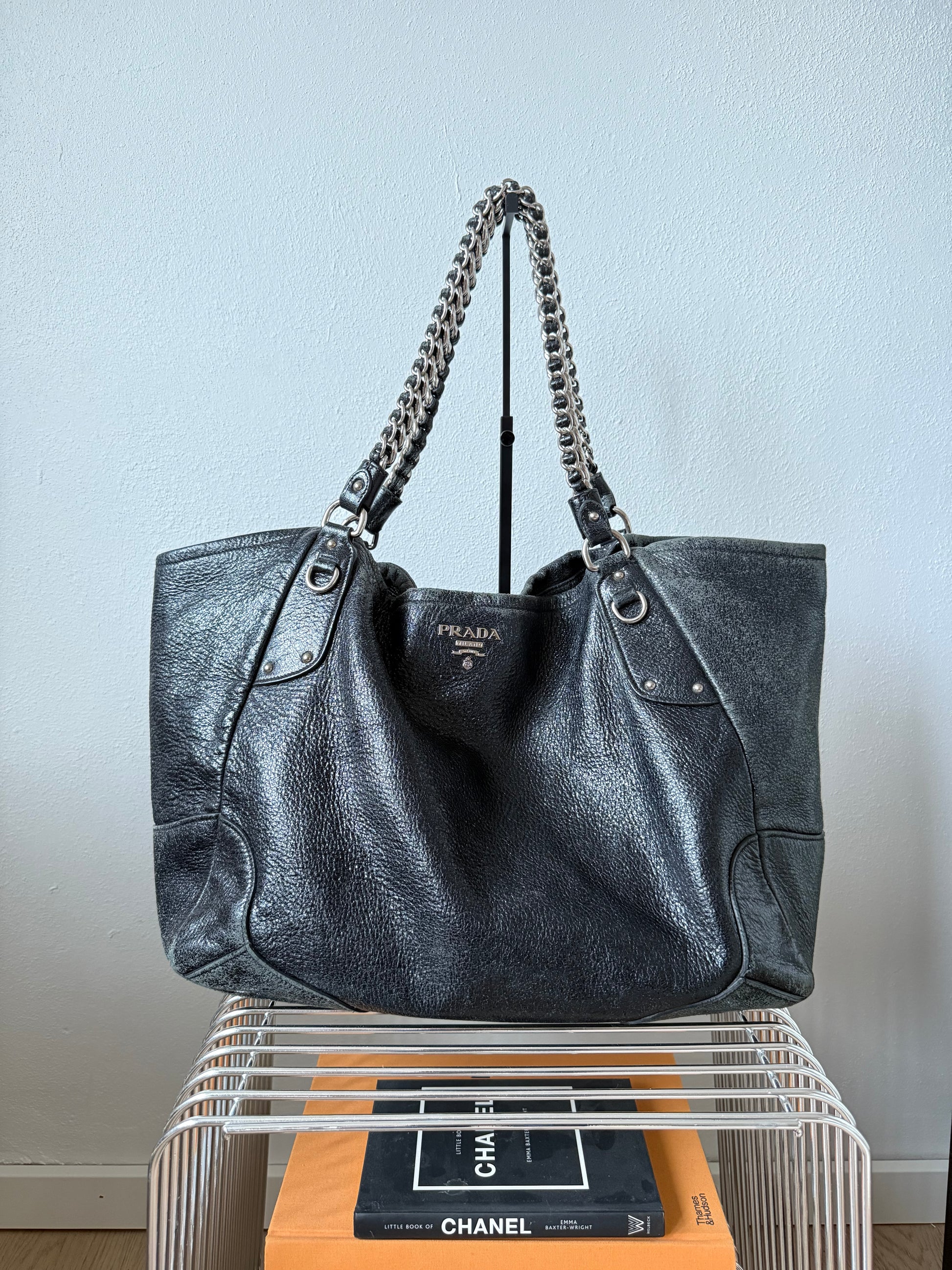 Super lækker og rå Prada Tote bag i kraftigt sort læder og kraftige sølv kæder.