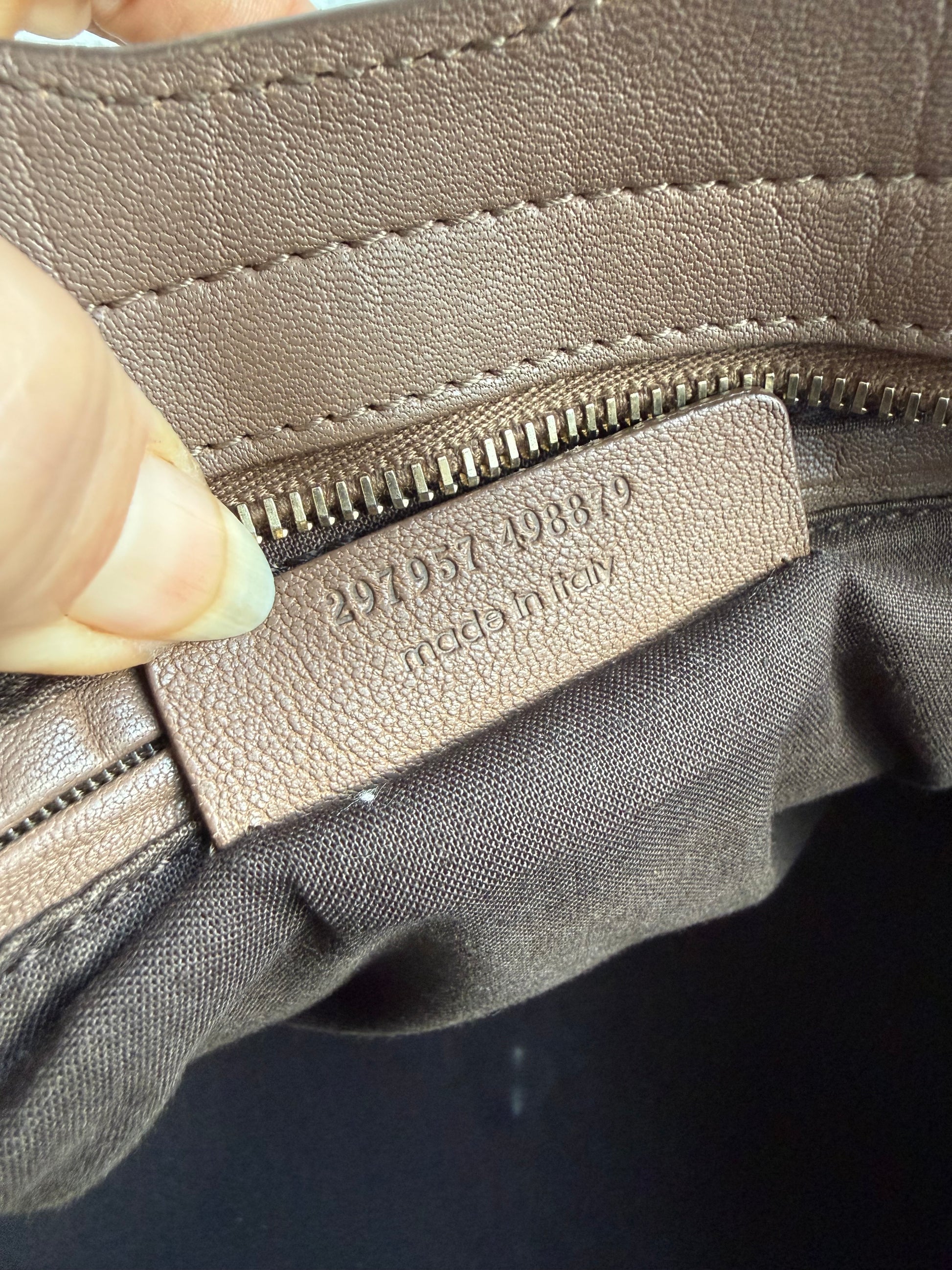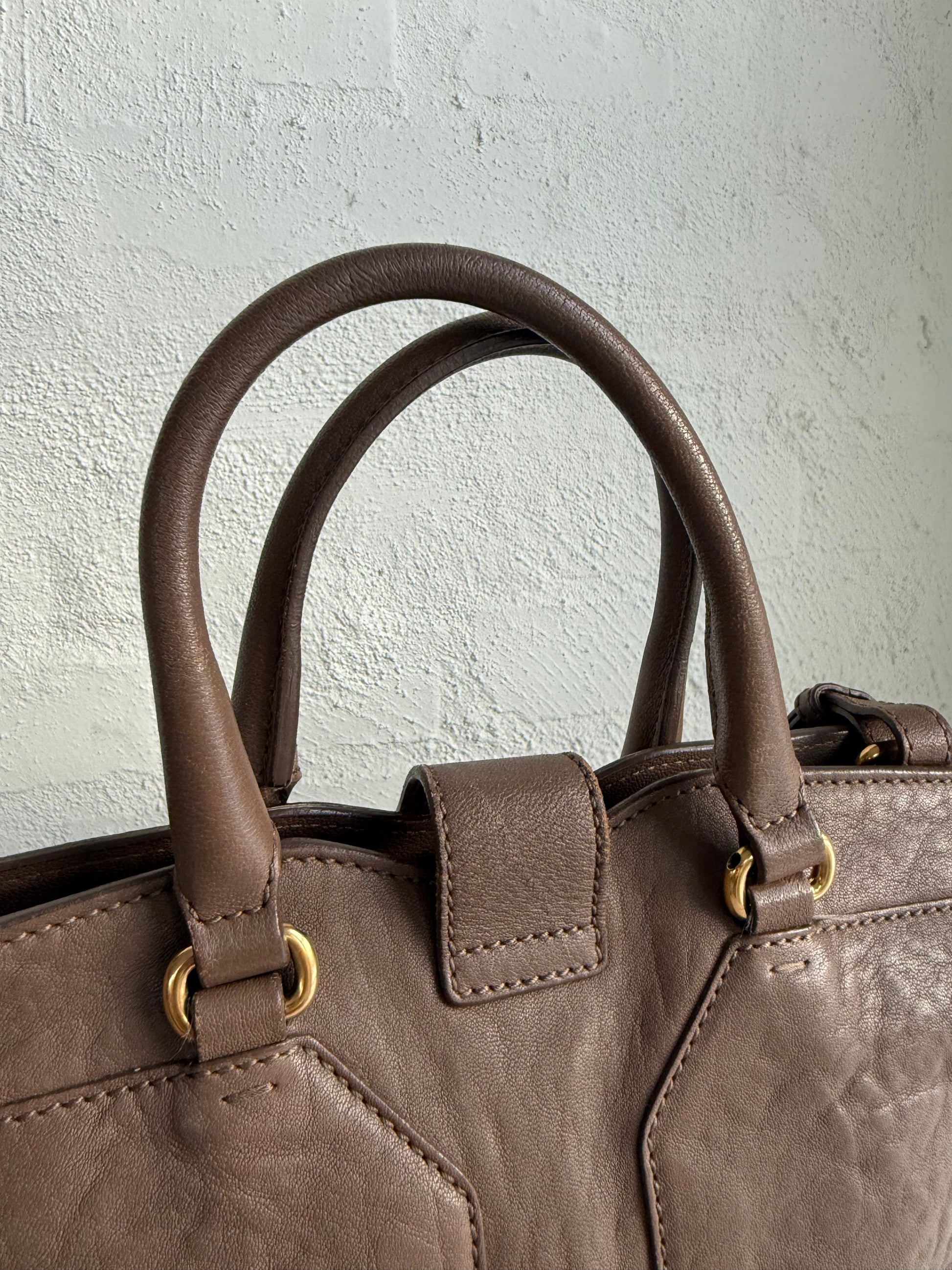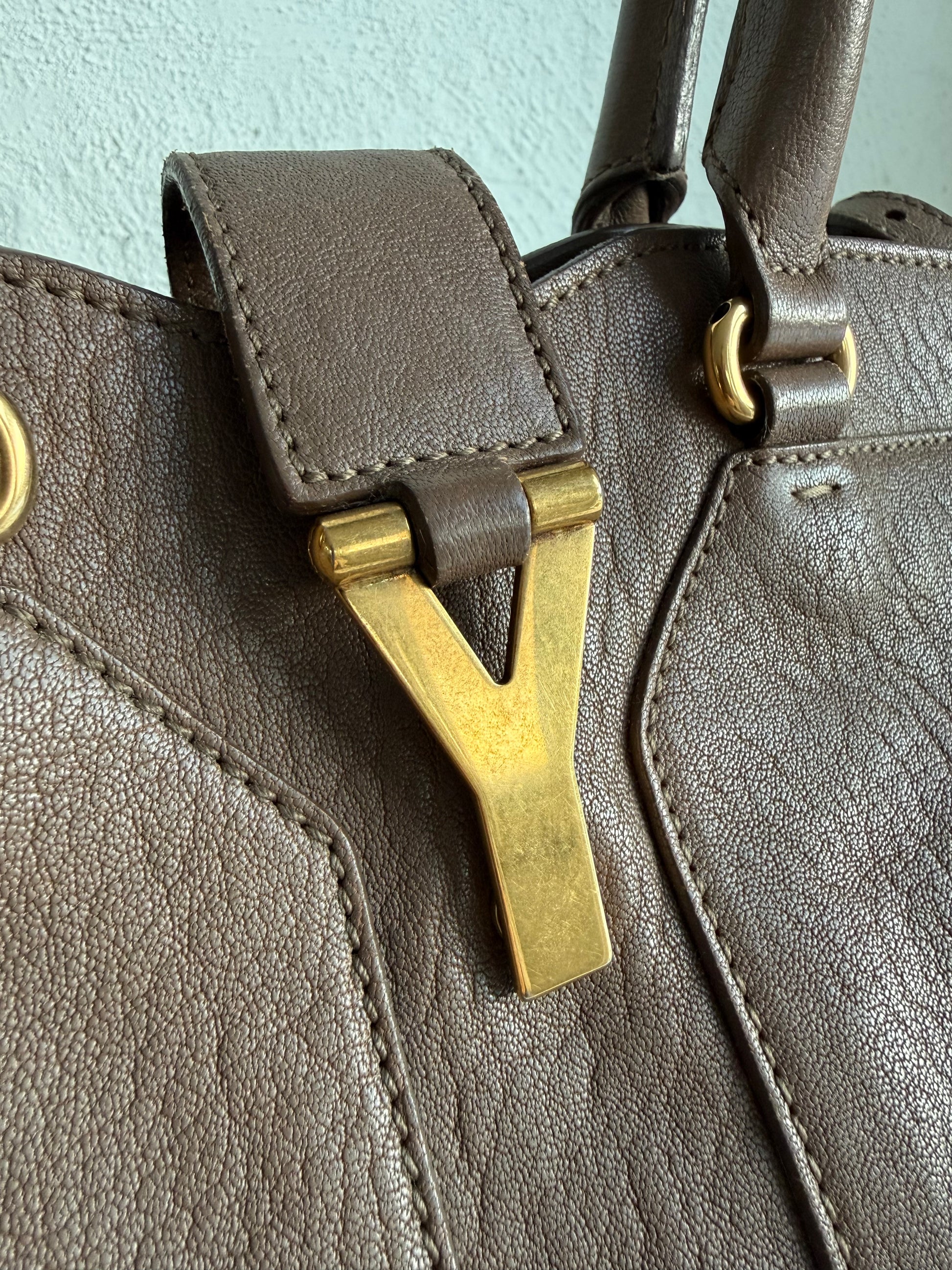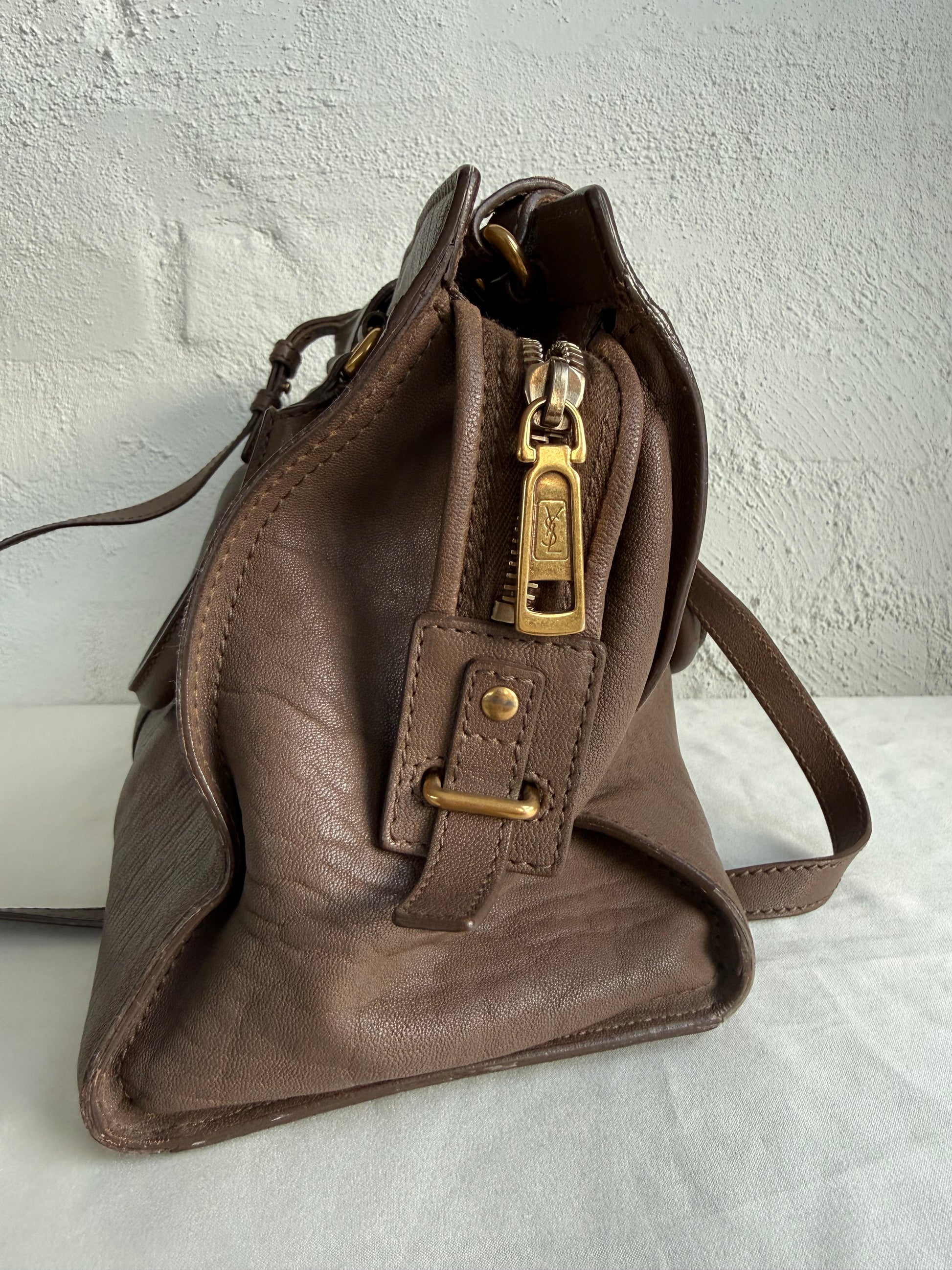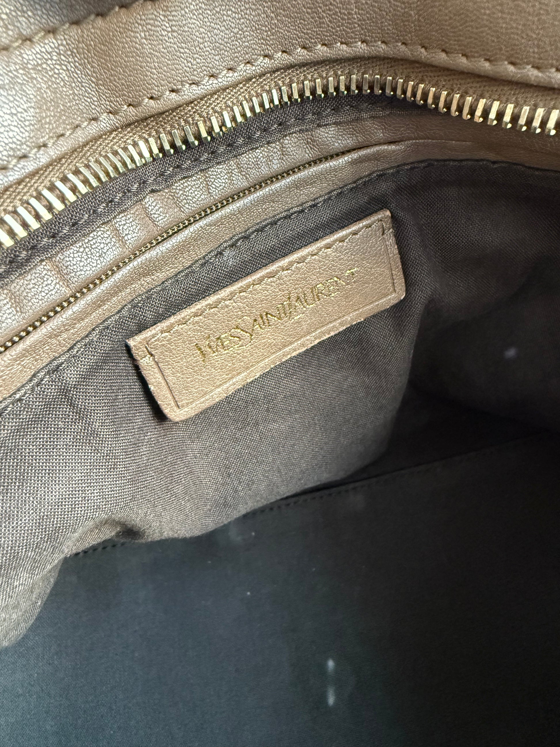 Den smukkeste ikoniske YSL taske, her i kraftigt taupe farvet læder og guldhardware. Farven er så smuk, og passer til det hele.